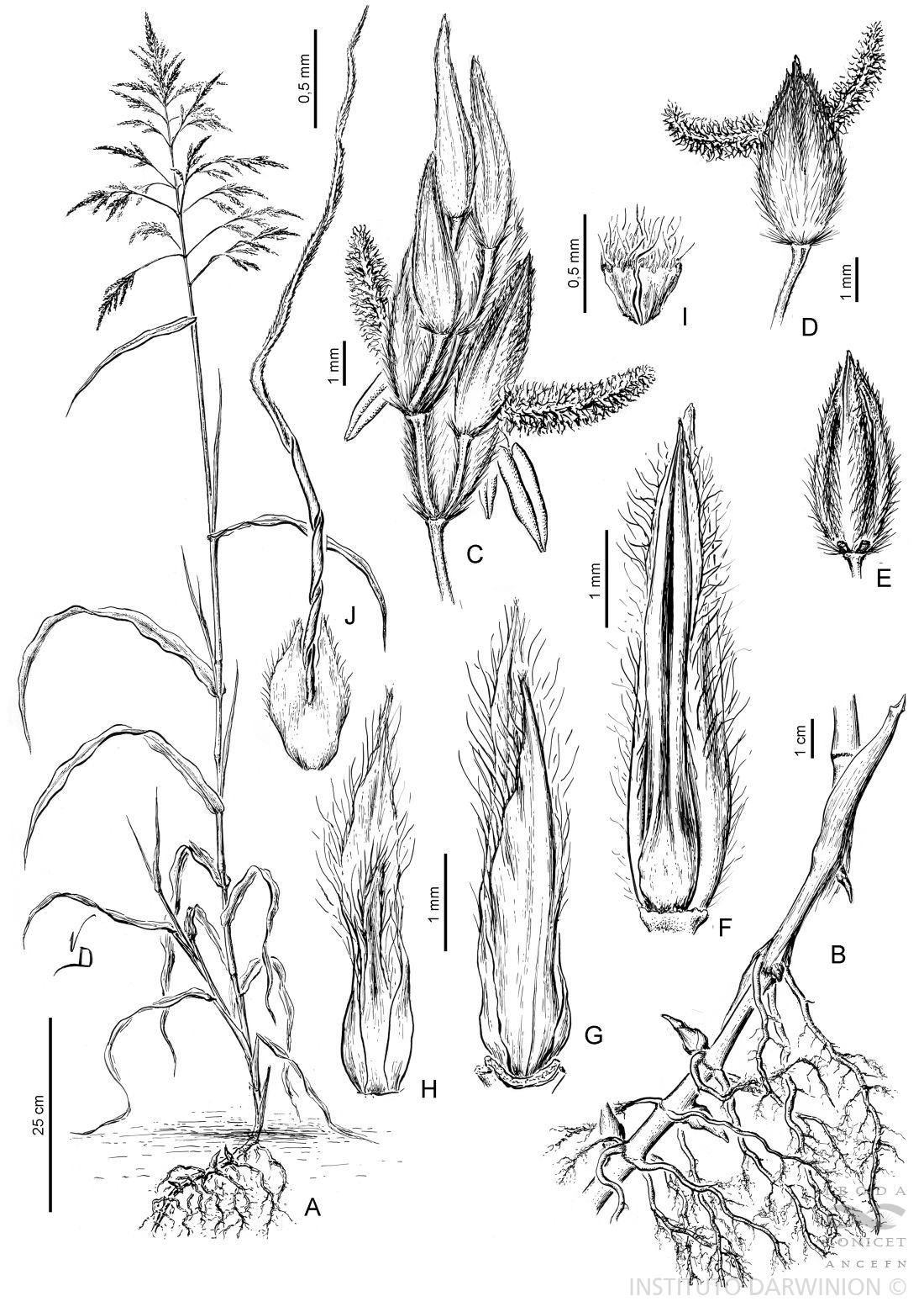 A. Planta. B. Rizoma. C. Porción apical de un raquis con pares de espiguillas y la espiguilla terminal sésil con dos espiguillas pediceladas. D. Espiguilla sésil terminal vista ventral. E. Espiguilla sésil terminal vista dorsal. F. Lemma estéril vista dorsal y gluma superior. G. Lemma fértil vista dorsal y lemma estéril. H. Antecio fértil vista ventral. I. Lodículas. J. Lemma fértil aristada de S. halepense var. halepense.