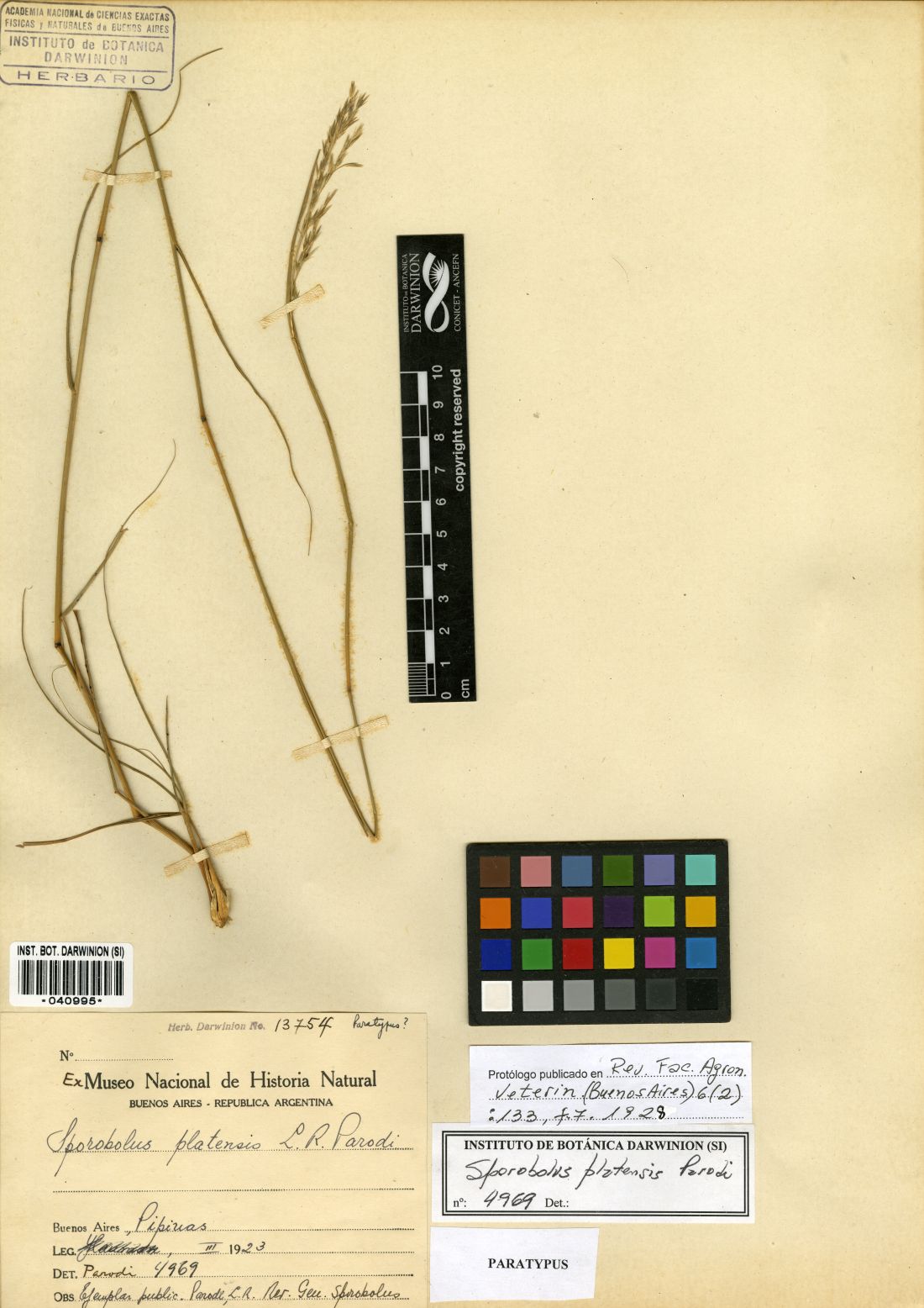 Observaciones: En las inflorescencias terminales casmógamas se observan anteras de 2-2,2 mm de largo; en espiguillas cleistógamas de las ramas inferiores de las inflorescencias terminales o en inflorescencias laterales, las anteras son de 0,2-0,4 mm de largo. Esta especie es afín a Sporobolus compositus (Poir.) Merr., que crece en América del Norte, especialmente a la variedad drummondii (Trin.) Kartesz & Gandhique, que presenta menor densidad de espiguillas en las ramas laterales de la inflorescencia. Sin embargo, Sporobolus platensis presenta frutos más largos, de 2,8-3 mm, con el embrión de ½ del largo del utrículo (vs. 1-2 mm, con el embrión mayor a ½ del utrículo); las glumas y la lemma son más agudas (vs. más redondeadas).