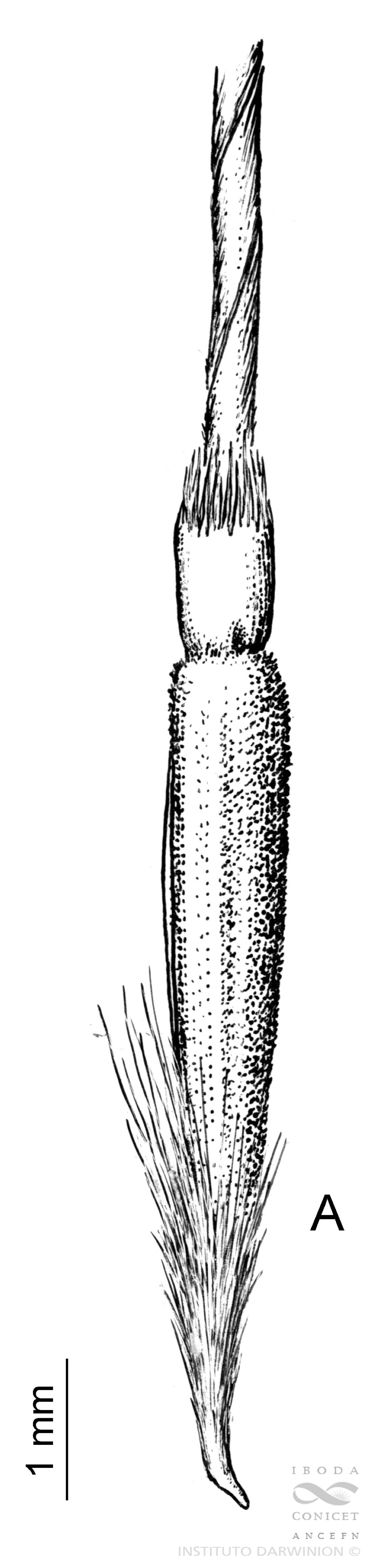 Plantas perennes, poco cespitosas, de 25-65 cm de alto; cañas cilíndricas de 0,7-1 mm de diámetro, erguidas, rectas, a veces geniculadas, simples, paucinodes; nudos ligeramente engrosados, rojizos, pubescentes; entrenudos longitudinalmente estriados, glaucos, glabros; vainas foliares estriadas, escabrosas, más cortas que los entrenudos, glaucas; lígulas truncadas, de 1,5-2 mm de largo, membranáceas, con margen entero, glabras; láminas foliares lineares convolutas, de 9-15 cm x 3-3,5 mm, estriadas, hispídulas sobre la cara abaxial, principalmente hacia los margenes. Inflorescencia erguida o algo nutante, pauciflora, extendida, de 10-15 cm de largo; raquis cilíndrico, liso; ramas y pedicelos aplanados, escabriúsculos. Espiguillas fusiformes, de 11-13 mm de largo; glumas subiguales, de 10-13 mm de largo, mayores que el antecio, atenuadas, membranáceas, hialinas a rojizas, glabras, la inferior 3-nervia, la superior 5-nervia; lemma cilíndrica, ligeramente angulosa, de 6-7 x ca. 1 mm de diámetro, papilosa en toda la superficie, más notablemente hacia la corona, glabra, con pelos densos sobre el tercio inferior del nervio dorsal; corona conspicua, ceñida en la base, blanquecina, de 0,6-0,7 mm de alto, con margen provisto de hilera de macropelos de 0,4-0,5 mm de largo y con 2 pequeñas concavidades o fosetas basales, una a cada lado de la línea dorsal; arista 2-geniculada, de 5,5-7 cm de largo, escabriúscula, robusta, persistente; antopodio agudo, de 1-1,2 mm de largo, densamente viloso; pálea hialina, ½ la longitud de la lemma, glabra; lodículas 2, lineares u oblongas, ca. 1 mm de largo.