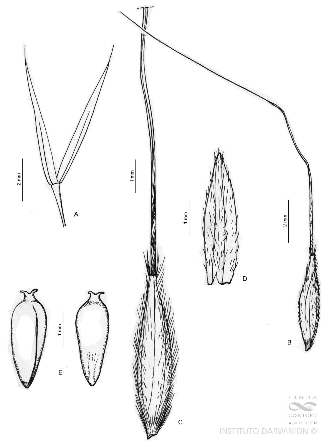 Plantas perennes, cespitosas, robustas, de 40-90 cm de alto; cañas cilíndricas, de 1-3(-4) mm de diámetro, erguidas, rectas, simples, paucinodes; nudos muy levemente comprimidos, pajizos, glabros; entrenudos inconspicuamente estriados, glabros; vainas foliares estriadas, mayores a menores que los entrenudos, glabras, con márgenes ciliados hacia el ápice y lóbulos vilosos, cuello glabro; lígulas truncadas u obtusas, de 0,2-0,5 mm de largo, membranáceas, con pelos en el dorso y el margen; láminas foliares lineares, convolutas o planas, de 8-35 cm x 0,5-0,8 mm, rígidas, hipofilo levemente estriado, levemente áspero, glabro, epifilo estriado, escabriúsculo, márgenes escabriúsculos, pilosos en la base. Inflorescencia apical contraída, de 10-25 cm de largo, exerta, a veces semicubierta por la vaina foliar, pluriflora, compuesta por flores casmógamas; inflorescencias basales paucifloras, con flores cleistógamas; raquis ramificaciones y pedicelos levemente estriados, angulosos, escabriúsculos en los ángulos. Espiguillas fusiformes, de 7-11 mm de largo; glumas subiguales, de 6-8 mm de largo, acuminadas, membranáceas, hialinas o bien violáceas con márgenes y ápice hialinos, 1-3-nervias, glabras, hispídulas sobre el nervio medio; lemma fusiforme, de 4-5,5 x 0,8-1 mm, con diminutos ganchos densos en la región apical y pelos cortos adpresos sobre toda la superficie; corona inconspicua, con hileras de pelos cortos (de 0,5-1,5 mm de largo), sobre el margen y adpresos a la arista; arista (1-)2-geniculada, de 10-18 mm de largo, hispídula en toda su extensión, persistente; antopodio obtuso, de 0,4-0,5 mm de largo, densamente viloso; pálea aguda, de 3,5-4,5 mm de largo, vilosa en el dorso, con algunos pelos que superan el ápice de la misma; lodículas 3, desiguales, 2 de ellas ca. 1,2 mm de largo, la restante menor; cariopsis fusiforme, de 2-3 mm de largo, hilo linear subigual a la longitud de la cariopsis.