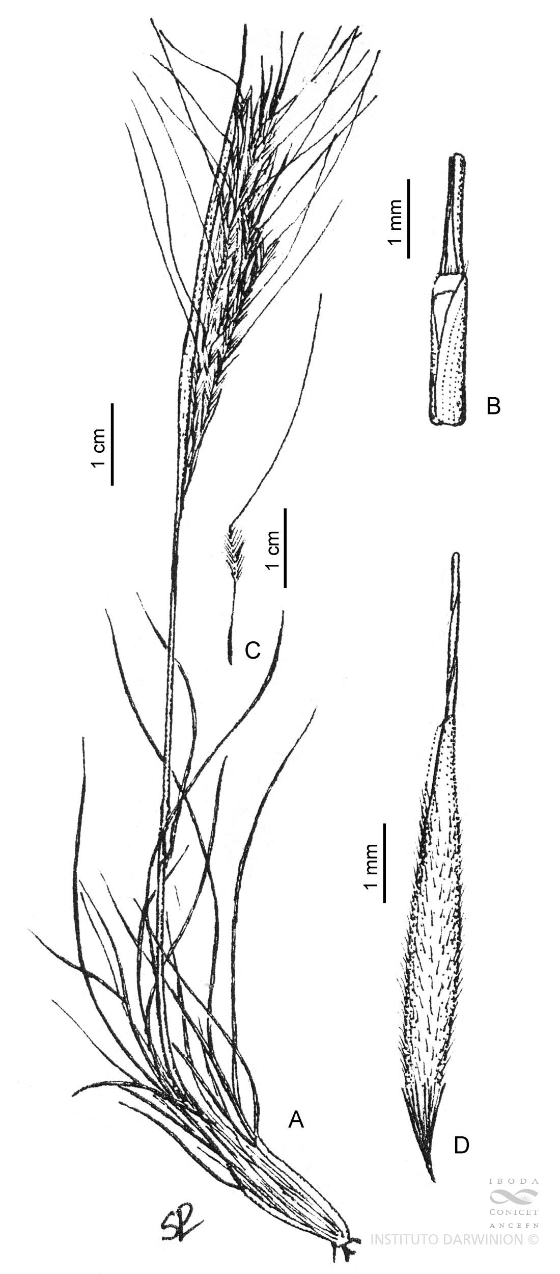 A, planta; B, lígula y parte de la hoja; C, antecio; D, antecio con la arista cortada.