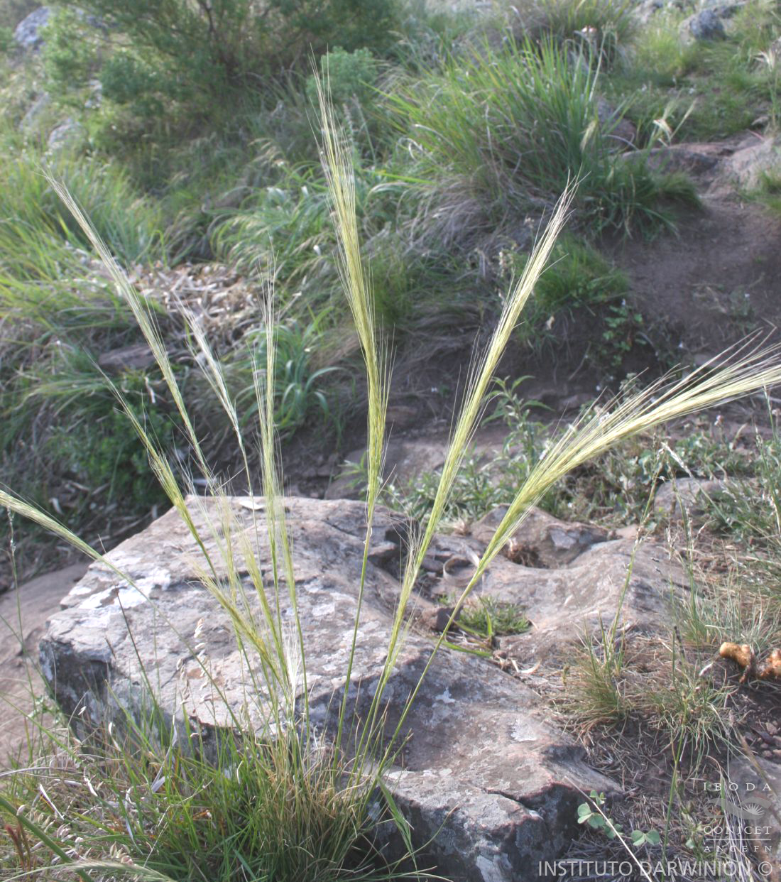 Plantas perennes, cespitosas, medianamente robustas, de (20-)60- 70 cm de alto; cañas cilíndricas, de 1-1,2 mm de de diámetro, erguidas, rectas, simples, paucinodes; nudos poco conspicuos, comprimidos o engrosados, castaños a pajizos, glabros; entrenudos longitudinalmente estriados, glabros; vainas foliares estriadas, iguales o menores que los entrenudos, glabras, con lóbulos, cuello y margenes glabros; lígulas 2- lobadas, de 0,5-1,5(-4) mm de alto, membranáceas, de margen irregular, glabras; láminas foliares lineares, convolutas, de 5-10 cm x 0,4-0,8 mm de diámetro, rígidas, ambas caras notablemente estriadas, epifilo pubérulo, hipofilo liso, glabro. Inflorescencia de 8-25 cm de largo, laxa o contraída, exerta, pauciflora o pluriflora; raquis cilíndrico, estriado, glabro; ramificaciones y pedicelos angulosos, híspidos. Espiguillas angostamente fusiformes, de 10-11 mm de largo; glumas subiguales, de 10-11 mm de largo, mayores que el antecio, conspicuamente atenuadas, membranáceohialinas, glabras, híspidas sobre el nervio medio, 3-nervias; lemma angostamente cilíndrico-fusiforme, de 5-7(-7,5) x 0,5-0,7 mm de diámetro, ralamente vilosa sobre los 2/3 inferiores, con pelos más densos sobre el nervio dorsal, el resto glabra, aspérula hacia el ápice; corona poco conspicua, continua con el cuerpo de la lemma, oblicua, con escasos aguijones e hilera de macropelos erguidos en su borde; arista 2-geniculada, de 5-8 cm de largo, escabriúscula en toda su extensión, grácil, caediza; antopodio agudo, de 1-2 mm de largo, densamente viloso; pálea obtusa, de 1,2-2 mm de largo, glabra o subglabra; lodículas 3, de 1-1,2 mm de largo, una menor que las otras 2; cariopsis cilíndrico-fusiforme, de 4-5 mm de largo; hilo linear, 2/3 del largo de la cariopsis.