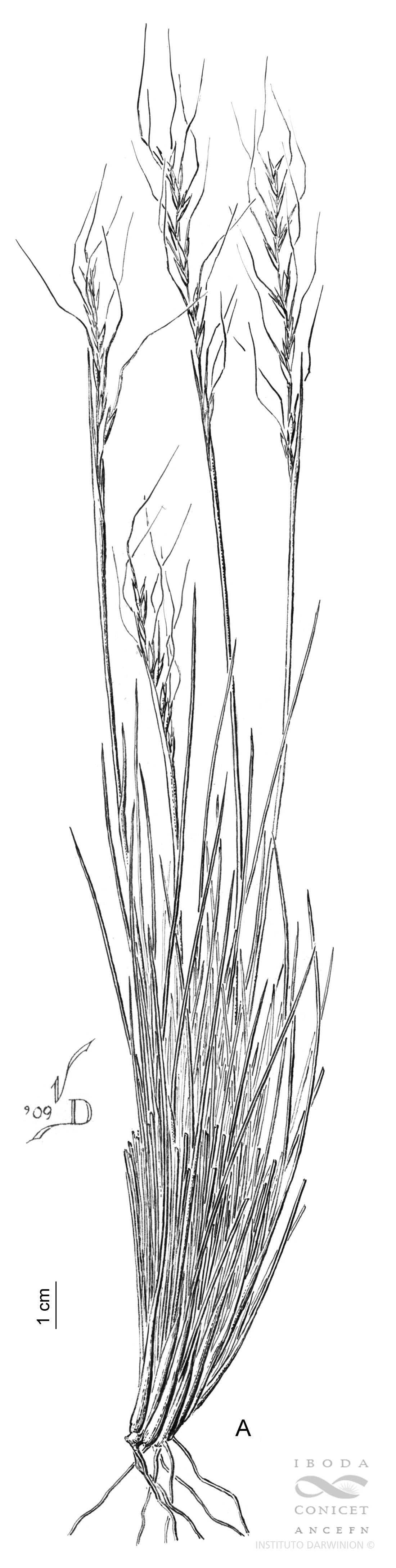 Plantas perennes, densamente cespitosas, de 25-60 cm de alto; ca- ñas cilíndricas, ca. 0,8 mm de diámetro, erguidas, rectas, simples, paucinodes; nudos poco conspicuos, levemente comprimidos, casta- ños, pubérulos; entrenudos longitudinalmente estriados, glabros a pubérulos, con pelitos antrorsos debajo de los nudos; vainas foliares conspicuamente estriadas, glabras, menores que los entrenudos, con margenes glabros; lígulas agudas, de 3-10 mm de largo, membranáceas, con margen laciniado, glabras; láminas foliares lineares, convolutas, rígidas y punzantes, de 5-10(-20) cm x 0,5-0,6 mm, ambas caras estriadas, glabras o levemente pubérulas, con margenes escabriúsculos. Inflorescencia erguida, notablemente exerta, pauciflora, de 5-10 cm de largo, angosta, con ramas adpresas al raquis; raquis aplanado, ligeramente sinuoso, escabroso, ramas y pedicelos angulosos, hispídulos en los ángulos. Espiguillas fusiformes, de 7-9 mm de largo; glumas subiguales, de 7-9 mm de largo, mayores que el antecio, atenuadas, membranáceas, glabras, a veces hispídulas sobre el nervio medio 3-nervias; lemma obovoide, gibosa, de 2,5-3,5 x 1 mm de diámetro, finamente estriada, glabra, brillante, con ganchos en el ¼ distal por debajo de la corona; corona inconspicua, continua con el cuerpo de la lemma, con hilera de macropelos erguidos hasta de 2 mm de largo; arista 2-geniculada, de 3- 3,5 cm de largo, hispídula en la columna, grácil, caediza; antopodio agudo, de 0,5-0,6 mm de largo, con densos macropelos blanquecinos de 5-6 mm de largo, que cubren totalmente y superan el antecio; pálea obtusa, tan larga como la lemma, glabra; lodículas 2, anchamente oblongas, ca. 1 mm de largo; cariopsis obovoidea, castaña, de 2 mm de largo; hilo linear, 2/3 del largo de la cariopsis.