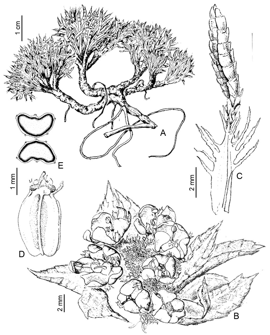 A. Cojín. B. Roseta. C. Hoja. D-E. Fruto, vista lateral y corte transversal, respectivamente.