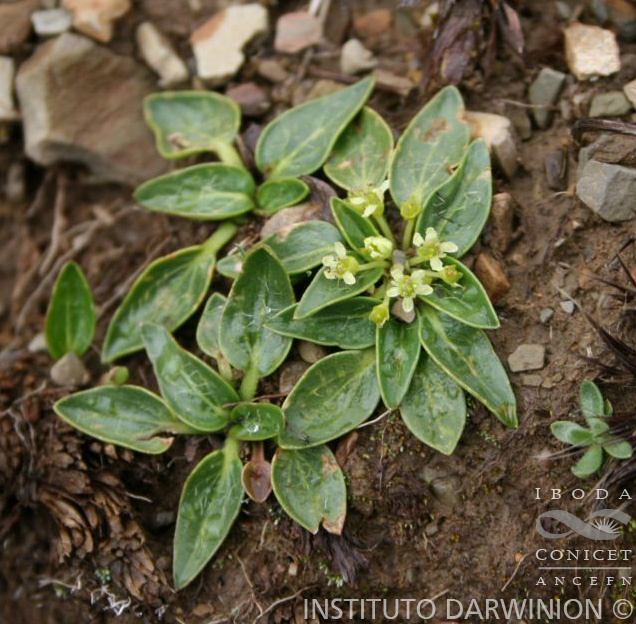 Subarbustos cespitosos o formando cojines chatos, hasta de 6 cm de alto; ramas viejas cubiertas en su porción distal por restos foliares persistentes. Hojas arrosetadas en el extremo de las ramas, pecioladas, cartáceas a subcoriáceas; lámina ovada o elíptica, de 5-20(-30) × 3-10 mm, plana, entera o generalmente 2-lobada (raro 3-lobada) en el ápice, glabra o estrigosa en la cara adaxial, lóbulos obtusos, inermes; pecíolos hasta de 20 mm de largo, a veces pulvinados, glabros hasta vellosos; base foliar algo ensanchada, membranácea, con margen ciliado, estípulas ausentes. Umbelas 10-20-floras, umbela terminal fructífera, sésil o con pedúnculo corto y grueso, hasta de 10 mm de largo; umbelas subapicales con fertilidad reducida, pedúnculos de 10-40 mm de largo; involucro de 5 a 13 brácteas, de igual longitud que los pedicelos, ciliadas, soldadas en la base. Flores blancoamarillentas; cáliz de dientes bien desarrollados, triangulares; pétalos oblongos, hasta de 1,3 mm de largo; pedicelos hasta de 10 mm de largo. Frutos ápteros, de contorno ovado, de 2,7-4 × 2-2,5 mm, comprimidos dorsalmente. Carpóforo ausente.