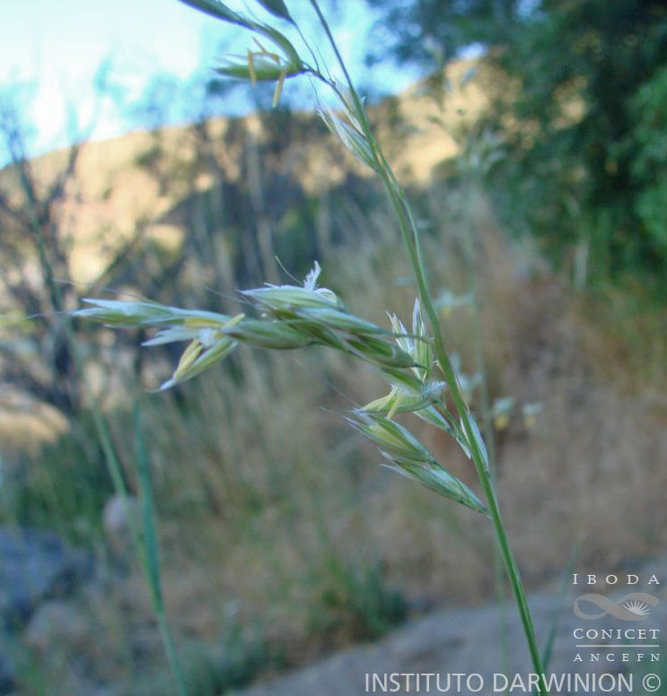 Plantas perennes; cañas de (20-)80-110 cm de alto, 2-5-nodes; nudos glabros; vainas glabras o las inferiores esparcidamente pilosas, menores que los entrenudos; lígulas de 0,5-2 mm de largo, truncadas, ciliadas, glabras en el dorso; láminas de (3-)10-16 cm x 2-4 mm, planas, glabras en la cara abaxial, escabrosas y esparcidamente pilosas en la cara adaxial. Inflorescencias de 5-18 x 2-8 cm, amarillo-doradas, brillantes, plurifloras, laxas, abiertas o contraídas. Espiguillas (1-)2-3(-4)-floras, de 5-7(-8,5) mm de largo; raquilla pilosa, de 1,2 mm de largo, con pelos hasta de 1 mm de largo; glumas desiguales, menores que la espiguilla, brillantes, escabrosas en la quilla; gluma inferior de 2-5 x 0,1-0,2 mm, linear-lanceolada, angosta, 1-nervia, subulada, usualmente ½ del largo de la superior, cubre entre ½ y ? de la espiguilla; gluma superior de 4-6,6 x 1 mm, 3-nervia, oval-lanceolada, puede cubrir totalmente a los antecios; lemmas de 4-6 mm, glabras, algo escabrosas hacia el ápice, aristadas en el ? o ¼ superior, 2-aristuladas en el ápice; aristas de 5-9 mm de largo, geniculadas y retorcidas en la base; callo con pelos cortos, ca. 0,5 mm de largo; páleas hialinas, poco menores que las lemmas, 2-nervias, los nervios escabrosos, el ápice bidentado o 2-setulado; ovario con el ápice glabro; estambres 3, anteras de 2-3 mm de largo; cariopsis de 2-3 mm de largo, comprimida, glabra; endosperma líquido.