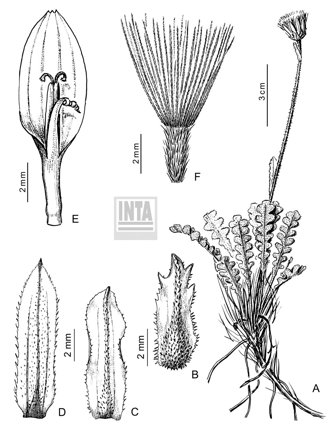 A. Planta. B. Filario externo. C. Filario intermedio. D. Filario interno. E. Flor (ovario y papus no dibujado). F. Aquenio y papus.