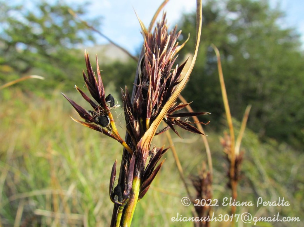 Planta de color verde pálido. Tallo de 60 cm de alto. Hojas de 30 cm X 1-4 mm. Panícula de 6 cm de alto, contraída, con 12-20 espiguillas pediceladas; bráctea inferior de 10-15 cm. Espiguillas de 9 mm, rojizas, uninucígeras; setas de longitud doble de la del aquenio, piloso-escabrosas por delante. Estilo trífido. Aquenio elipsoide, trígono, piramidal en los extremos, liso, de color castaño, lustroso.