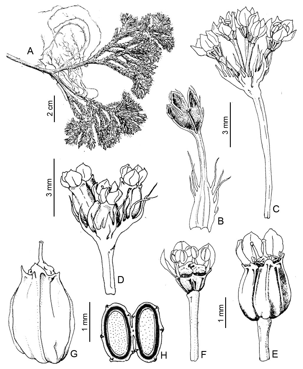 A. Fragmento del cojín. B. Hoja. C. Umbela con flores estaminadas. D. Umbela fructífera. E. Flor pistilada con estaminodios. F. Flor estaminada G-H. Fruto,vista dorsal y corte transversal, respectivamente.