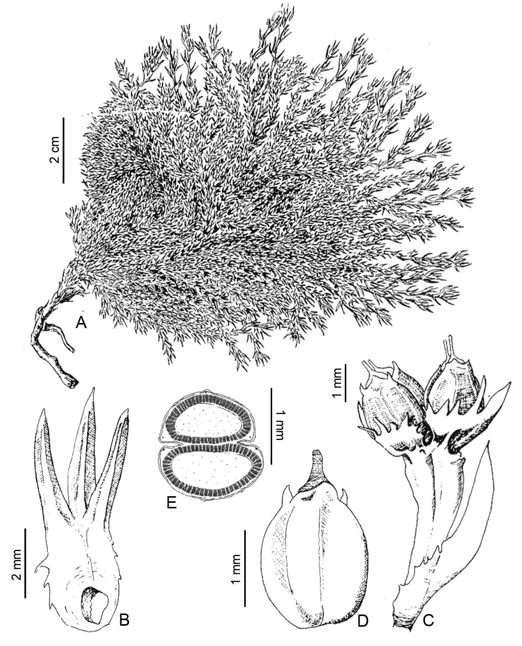 A. Fragmento del cojín. B. Hoja. C. Umbela. D-E. Fruto, vista dorsal y corte transversal, respectivamente.