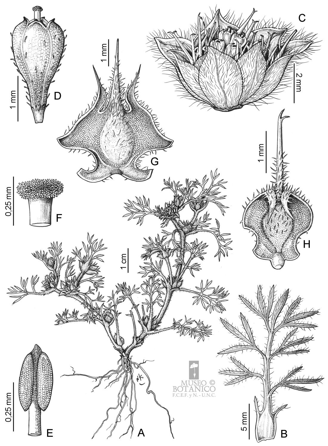 A. Planta. B. Hoja. C. Capítulo. D. Flor del centro. E. Estambre. F. Porción distal del estilo. G, H. Aquenios.