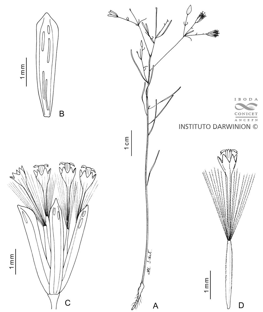 Sufrútices ginodioicos, ramoso-divaricados, hasta de 60 cm de alto; tallos ramificados desde la base, teretes, estriados, oscuros, glabros. Hojas alternas, cortamente pecioladas, láminas linearfiliformes, de 2-5,5 cm × 0,1-1 mm, agudas. Capítulos sobre pedúnculos muy delgados de 4-15 mm de largo, formando en su conjunto una cima paniculiforme muy laxa. Involucro cilíndrico; filarios 5, linear-lanceolados a lanceolados, agudos, castaño-purpúreos, con márgenes hialinos, membranáceos y dorso provisto de glándulas lineares. Flores ca. 15 con las corolas de 8-10 mm de largo, las pistiladas con tubo linear largo y limbo breve, infundibuliforme, purpúreo; las perfectas con corola tubulosa. Aquenios cilíndricos, lineares, de 5-7 mm de largo, estriados, obscuros, escabroso-pubescentes; papus leonado de 7-15 mm de largo.