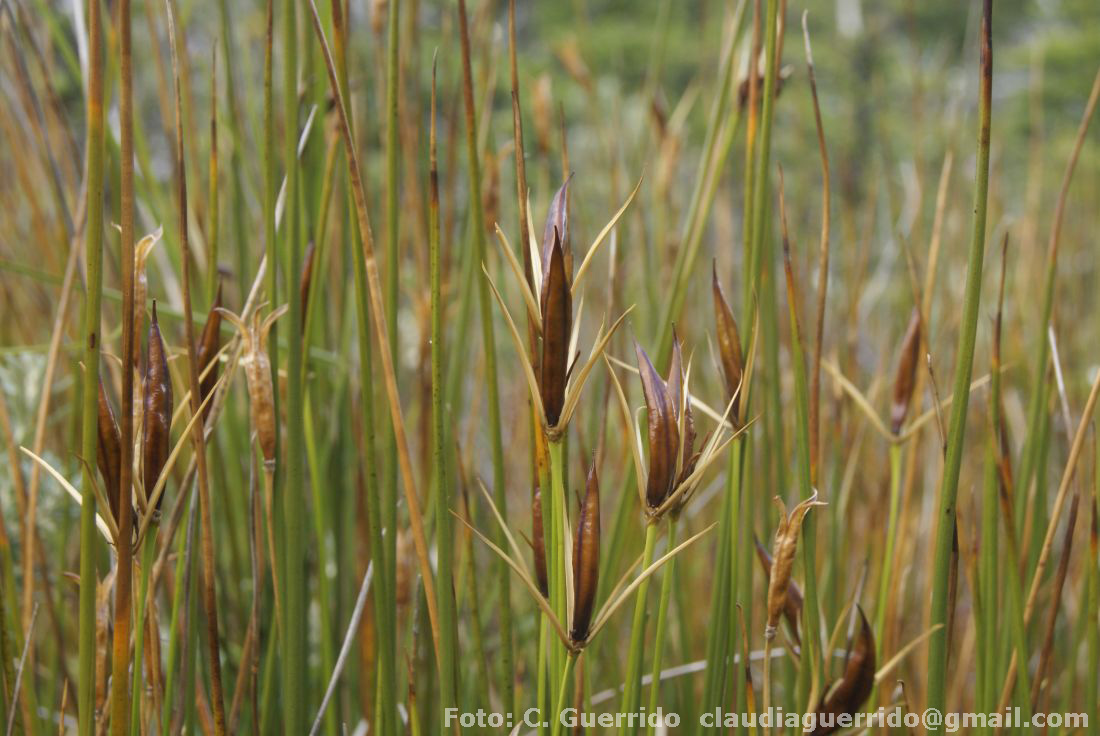 Perenne. Tallo de 30-50 cm o más, con 2-3 catáfilas escamosas y 2 vainas áfilas en la base. Hoja única cauliforme, más larga que el tallo, de 1,5 mm de espesor, envainadora y acanalada en la base, punzante. Flor de 2-4 cm; profilos 1-2 pequeños. Tépalos externos lanceolados, agudos, duros, espesados en el dorso, de bordes hialinos angostos. Tépalos internos más cortos, de bordes más anchos. Estambres 6, más cortos que los tépalos, de filamento breve, rojizo; anteras lineares, de tecas un poco más largas que el conectivo. Ovario triseptado; estilo filiforme; estigmas 3, largos, papilosos. Fruto prismático de 20-24 mm, de pericarpio leñoso; semillas escobiformes de 5-7 mm, blanquecinas, con un núcleo herrumbroso de 1 mm.