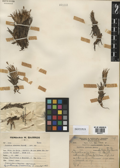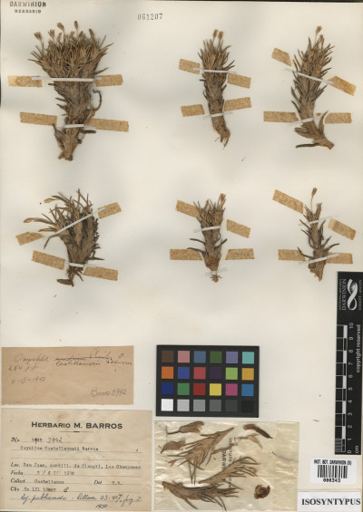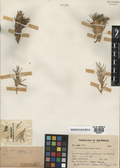Material Tipo: Argentina. San Juan. Dpto. Iglesia. Cordillera de Colangüil, "Los Champones", 4200 m, 5/6 Feb 1950, A. Castellanos s.n. (LIL-16042, LIL-16069, LIL-16133, W 1957-0004793, W 1957-0004801, ¿BA?).