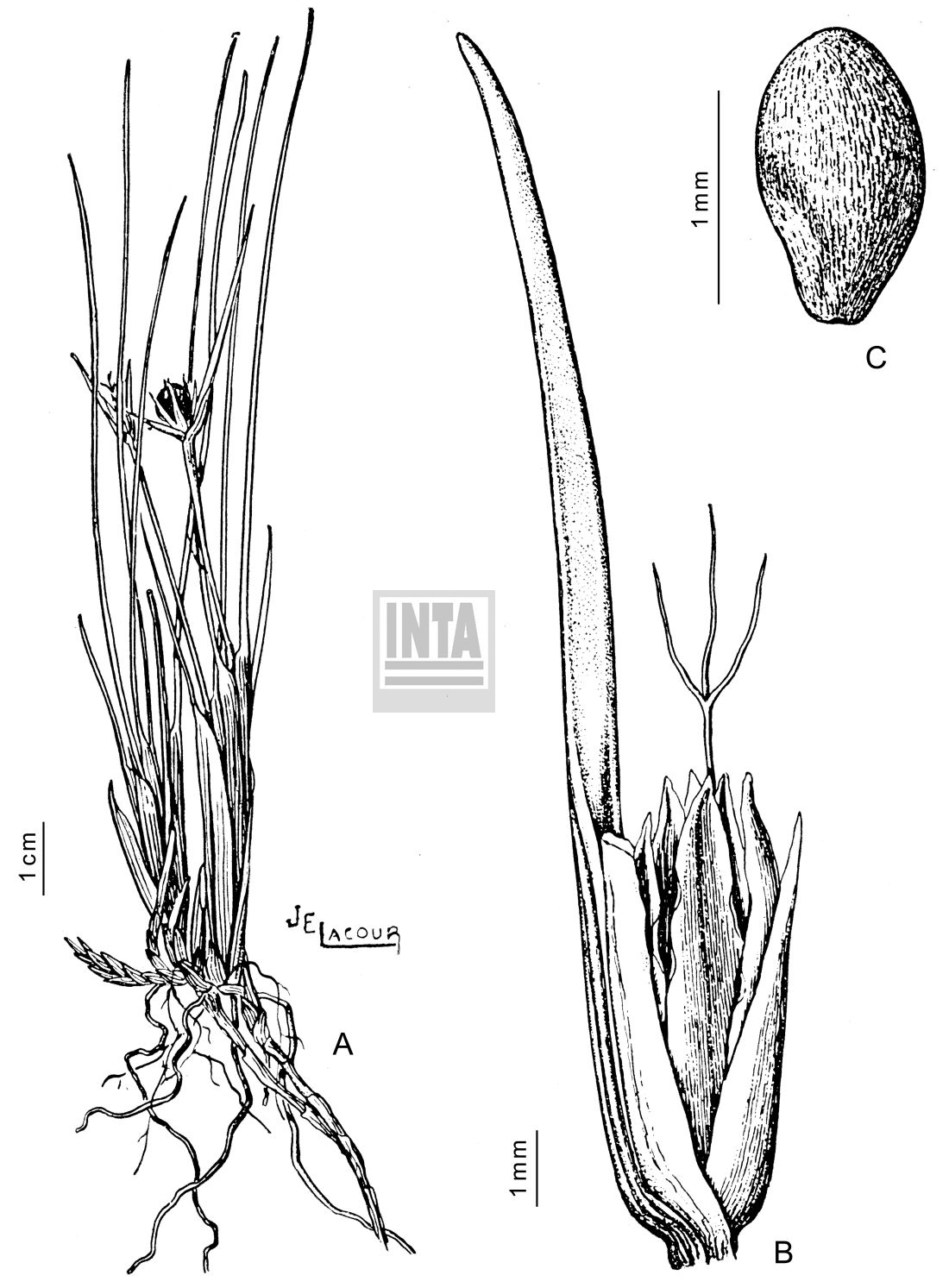 Perenne, cespitosa. Rizoma ramificado. Tallo cilindrico de 7-30 cm de alto con 2 catáfilas escamosas y 2 vainas áfilas en la base. Hojas erguidas, tiesas, unas más largas que el tallo y otras más cortas, con 2-4 tubuladuras, acanaladas, punzantes. Flor de 7-10 mm; pro-filo inferior prolongado en apéndice foliar de 18-35 mm; profilo superior membranáceo. Tépalos obtusos castaños, los externos de 8-9 mm, los internos de 7-8 mm. Estambres 6; anteras lineares con el conectivo prolongado en mucrón rojizo. Ovario trígono; estilo del largo del ovario; estigmas parduscos. Fruto esférico-oval, unilocular, de paredes casi leñosas; semillas de 1,2-1,4 mm, de superficie sutilmente reticulada.
