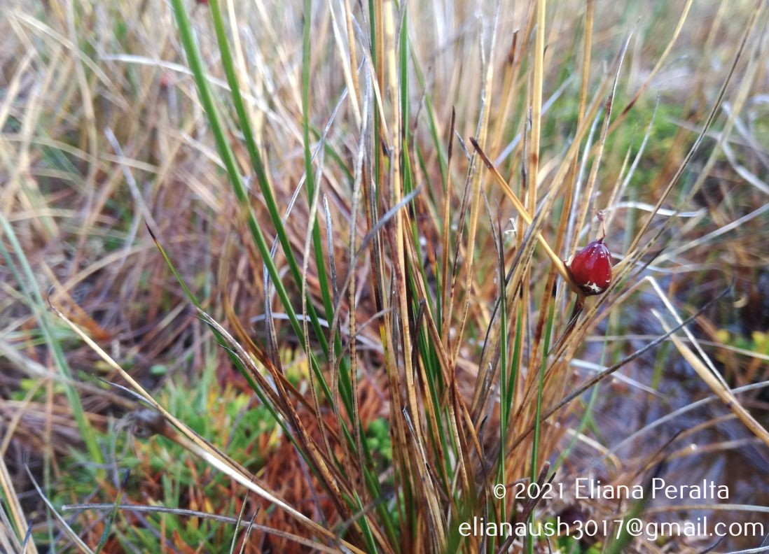 Perenne, cespitosa. Rizoma ramificado. Tallo cilindrico de 7-30 cm de alto con 2 catáfilas escamosas y 2 vainas áfilas en la base. Hojas erguidas, tiesas, unas más largas que el tallo y otras más cortas, con 2-4 tubuladuras, acanaladas, punzantes. Flor de 7-10 mm; pro-filo inferior prolongado en apéndice foliar de 18-35 mm; profilo superior membranáceo. Tépalos obtusos castaños, los externos de 8-9 mm, los internos de 7-8 mm. Estambres 6; anteras lineares con el conectivo prolongado en mucrón rojizo. Ovario trígono; estilo del largo del ovario; estigmas parduscos. Fruto esférico-oval, unilocular, de paredes casi leñosas; semillas de 1,2-1,4 mm, de superficie sutilmente reticulada.