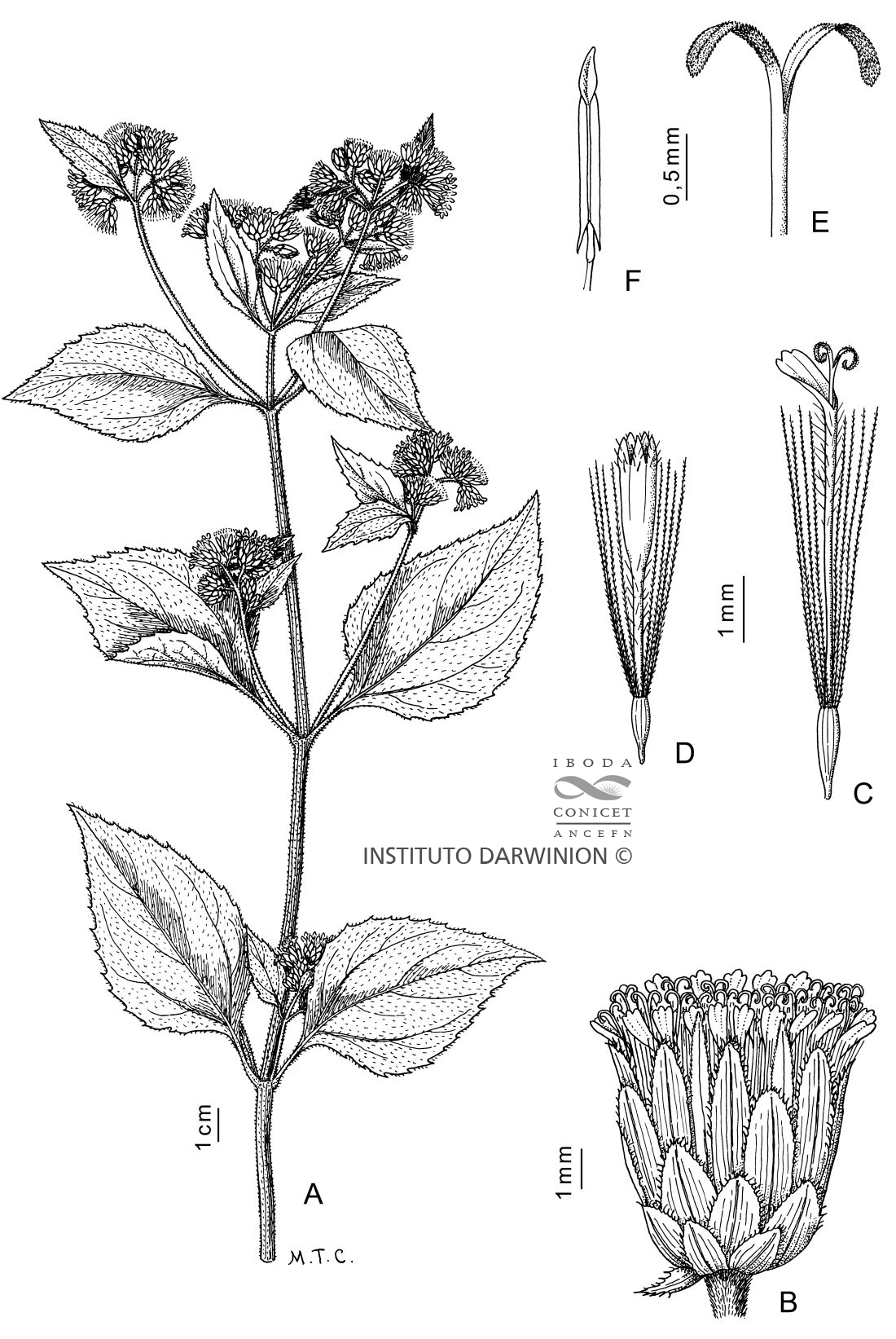 A. Rama florífera. B. Capítulo. C. Flor del margen. D. Flor del centro. E. Parte superior del estilo. F. Estambre.