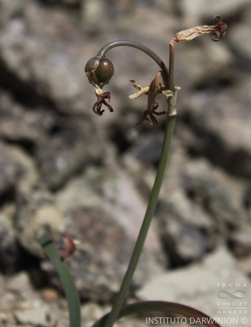 Planta de 11-22 cm de alto. Bulbo oblongo-ovoide de 12-32,5 x 6-16 mm, blancuzco, con raíces algo carnosas y un cuello de 3,5-7 mm. Hojas 3-6, lineares, con frecuencia espi-raladas hacia el ápice o a veces ± falcadas o derechas, de 8-24 cm X 2-3,5 mm, de ápice algo obtuso. Escapo de 5-18 cm x 0,8-2,8 mm. Espata con valvas lanceoladas, de 14-23 mm, soldadas, de 1,6-4,2 mm hacia la base. Inflorescencia 2-5-flora. Flores verdosas o pardo-purpúreas, algo inclinadas; pedicelos de 10-35 mm. Tépalos concrescentes en un tubo de 8,5-12,5 mm, luego libres, extendidos, rollizos, obtusos, de 4,7-7,5 x 1-1,2 mm. Filamentos casi filiformes o aplanados pero muy angostos, los episépalos insertos a 3,5-3,7 mm de la base del tubo, de 0,8 1,4 mm, los epipétalos insertos a 1-1,7 mm de la base del tubo, de 2,2-2,5 mm; anteras erguidas, oblongas, amarillas, de 1,3-1,7 mm. Ovario ovoide, de 2,2-3,5 x 1,5-2,5 mm de ancho; estilo aprox. de 1,4 mm, estigma capitado.