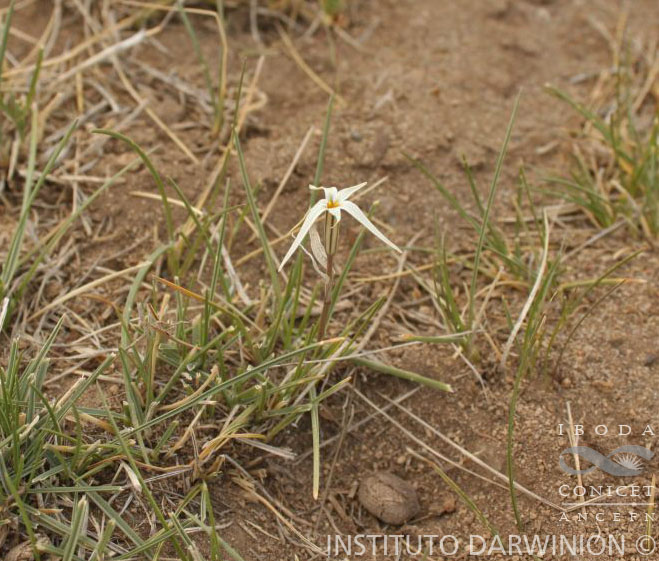 Planta de 7-9 cm de alto. Bulbo ovoide u oblongo-ovoide, de 16-20 mm X 7-9 mm, provisto de un cuello endeble de 20-25 mm. Hojas 1-2, lineares, de 6-8 mm X 0,7-1,8 mm, de ápice obtuso. Escapo grácil de 4,5-8 cm X 0,8-1,1 mm. Espata bivalva, uniflora o biflora; valvas blancuzcas, algo estriadas, lanceoladas, aprox. de 19 mm X 2,2-2,8 mm, soldadas 2,2 mm hacia la base. Pedicelos de 2-40 mm. Flor erguida, blanca con una estría parda o pardo-verdosa en el envés de los tépalos, aprox. de 12 mm de largo X 10-35 mm de diámetro. Tépalos agudos u obtusos, concrescentes de 11-20 mm, luego extendidos, los exteriores de 10-14,5 mm X 2-6,4 mm, los interiores de 8,5-10 mm X 2-5,8 mm. Filamentos muy angostos, los episépalos insertos a 3,3-5,3 mm de la base del tubo que forman los tépalos, de 3-4,8 mm, los epipétalos a 5,5-6,5 mm de labase, de 3,5-5,5 mm; anteras algo incurvas, amarillas, aprox. de 1,1 mm. Ovario oblongo de 2,6-3 mm y 0,9-15 mm; estilo filiforme, de 5,5-7,7 mm; estigma capitado-trilobado.