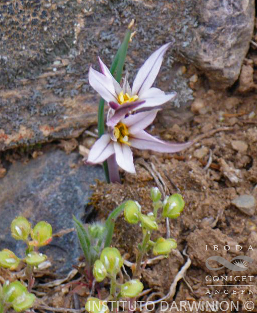 Planta de 7-9 cm de alto. Bulbo ovoide u oblongo-ovoide, de 16-20 mm X 7-9 mm, provisto de un cuello endeble de 20-25 mm. Hojas 1-2, lineares, de 6-8 mm X 0,7-1,8 mm, de ápice obtuso. Escapo grácil de 4,5-8 cm X 0,8-1,1 mm. Espata bivalva, uniflora o biflora; valvas blancuzcas, algo estriadas, lanceoladas, aprox. de 19 mm X 2,2-2,8 mm, soldadas 2,2 mm hacia la base. Pedicelos de 2-40 mm. Flor erguida, blanca con una estría parda o pardo-verdosa en el envés de los tépalos, aprox. de 12 mm de largo X 10-35 mm de diámetro. Tépalos agudos u obtusos, concrescentes de 11-20 mm, luego extendidos, los exteriores de 10-14,5 mm X 2-6,4 mm, los interiores de 8,5-10 mm X 2-5,8 mm. Filamentos muy angostos, los episépalos insertos a 3,3-5,3 mm de la base del tubo que forman los tépalos, de 3-4,8 mm, los epipétalos a 5,5-6,5 mm de labase, de 3,5-5,5 mm; anteras algo incurvas, amarillas, aprox. de 1,1 mm. Ovario oblongo de 2,6-3 mm y 0,9-15 mm; estilo filiforme, de 5,5-7,7 mm; estigma capitado-trilobado.