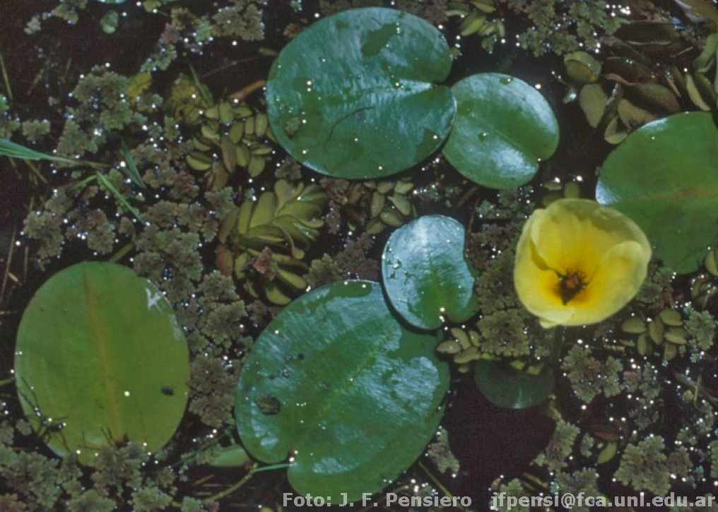 Perenne, acuática, de hojas las primeras sumergidas, reducidas a folíolos lineares, las restantes con pecíolo cilíndrico, de 10-40 cm de largo, de base brevemente envainadora, y lámina flotante, anchamente aovada hasta suborbicular, levemente acorazonada en la base y ápice obtuso, hasta 10 cm de largo, 7-9-nervada; escapo aproximadamente igualando a los pecíolos, seudo-umbelas con 2-4 flores, a veces alguna umbélula secundaria y casi siempre 1 ó 2 brotes vegetativos; brácteas de 15-40 mm de largo, aovadas, agudas; pedicelos de 10-20 cm, flores durante la antesis emergentes del agua, grandes y vistosas, sépalos ca. 25 mm de largo verdes, aovados, obtusos, coriáceos; pétalos hasta 50 mm de largo suborbiculares, superando ampliamente los sépalos, amarillentos, muy fugaces, estambres cerca de 20 a 40 (los exteriores, ca. 20 a veces estériles), filamentos de los estambres fértiles ca. 8 mm de largo, rojo-purpúreos, anteras amarillas, lineales; gineceo compuesto de 4-8 carpelos, ca. 13 mm de largo, atenuados en estilos, con estigmas poco dilatados, papilosos. Cápsulas maduras ca. 15 mm de largo, elipsoides, rostradas; semillas numerosas.