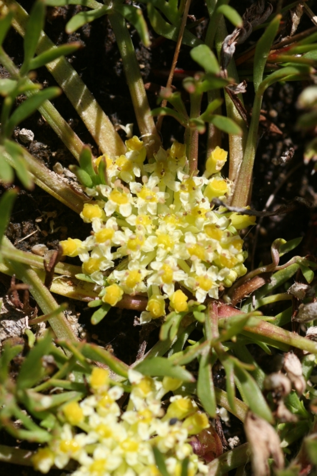 Plantas cespitosas, rizomatosas; ramas cubiertas en su porción distal por las vainas foliares persistentes. Hojas arrosetadas en el extremo de las ramas, pecioladas, cartáceas; lámina de 10-30 × 10-40 mm, palmatisecta, dividida en tres segmentos enteros o generalmente pinnatisectos, plana, glabra, últimas divisiones de la lámina lineares, agudas o subobtusas, de 2-10 mm de largo, ápice agudo a obtuso, inerme; pecíolos a veces pulvinados, de 10 a 70 mm de largo; base foliar más o menos ensanchada, membranácea, con margen ciliado, sin estípulas. Umbelas 10-40-floras, perfectas; pedúnculos de 20-50 mm de largo; involucro de 5 a 10 brácteas, hasta 10 mm de largo, margen escarioso-ciliado, soldadas en la base. Flores blancoamarillentas, cáliz de dientes bien desarrollados, hasta de 0,5 mm de largo; pétalos ovados, de 1-1,5 mm de largo; pedicelos de 4-10 mm de largo. Frutos ápteros, de contorno elíptico, de 2-3 × 1,5-2,5 mm, dorsalmente comprimidos. Carpóforo ausente.