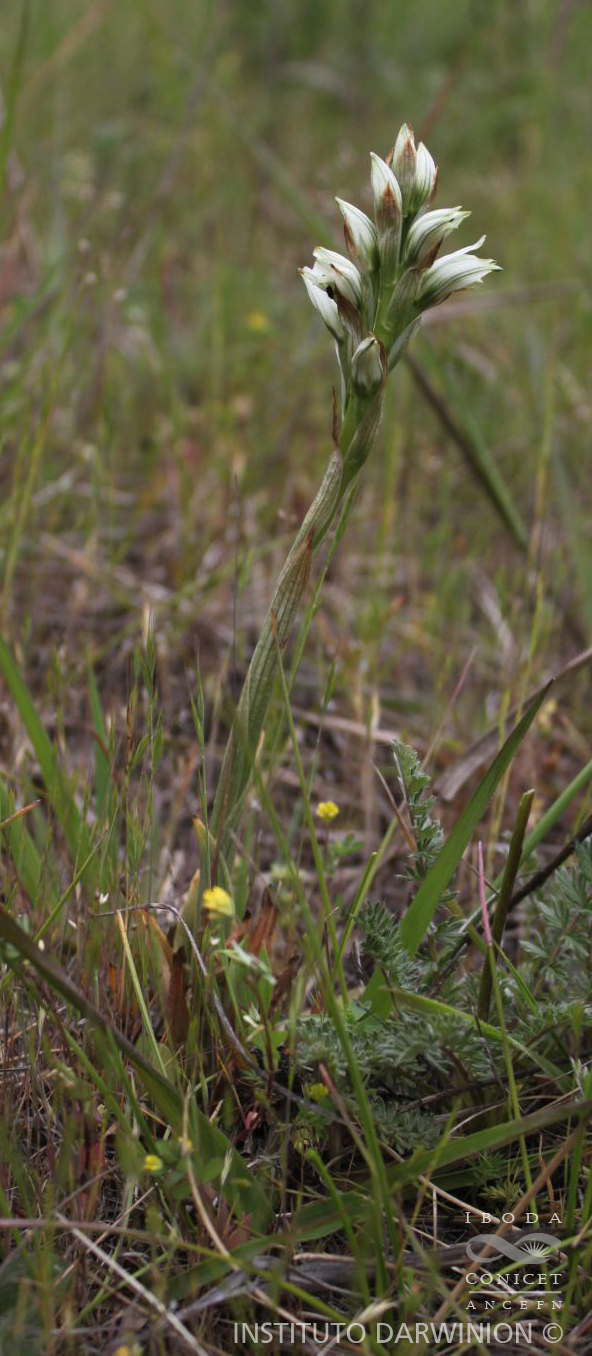 Planta de 18-30 cm de altura. Hojas de 4-8 X 1,2-1,5 cm, lanceoladas, atenuadas en seudopecíolo, hojas caulinares angostas, con ápice castaño. Inflorescencia en espiga triangular, corta, pauciflora (8-15 flores), abriéndose poco durante la floración. Flor pequeña, blanco-amarillenta, con nervadura verde oscuro. Sépalos membranáceos de 15-17 X ± 4 mm, 3-nervados, el dorsal lanceolado, los laterales ligeramente arqueados, con ápice, a veces, carnoso. Pétalos oblongos, obtusos o acuminados de 13-14 X 3-3,5 mm, 3-nervados. Labelo de 11-12 X 5-6 mm, trilobado, largamente unguiculado; lóbulo central lanceolado, acuminado, recorrido por 5 nervios cubiertos de laminillas membranáceas, falcadas, con el ápice engrosado y oscuro; lóbulos laterales obtusos recorridos por nervios oblicuos provistos de algunas laminillas o engrosamientos; ápice del labelo desnudo y membranáceo. Columna corta, de 8 mm, con ala recta.