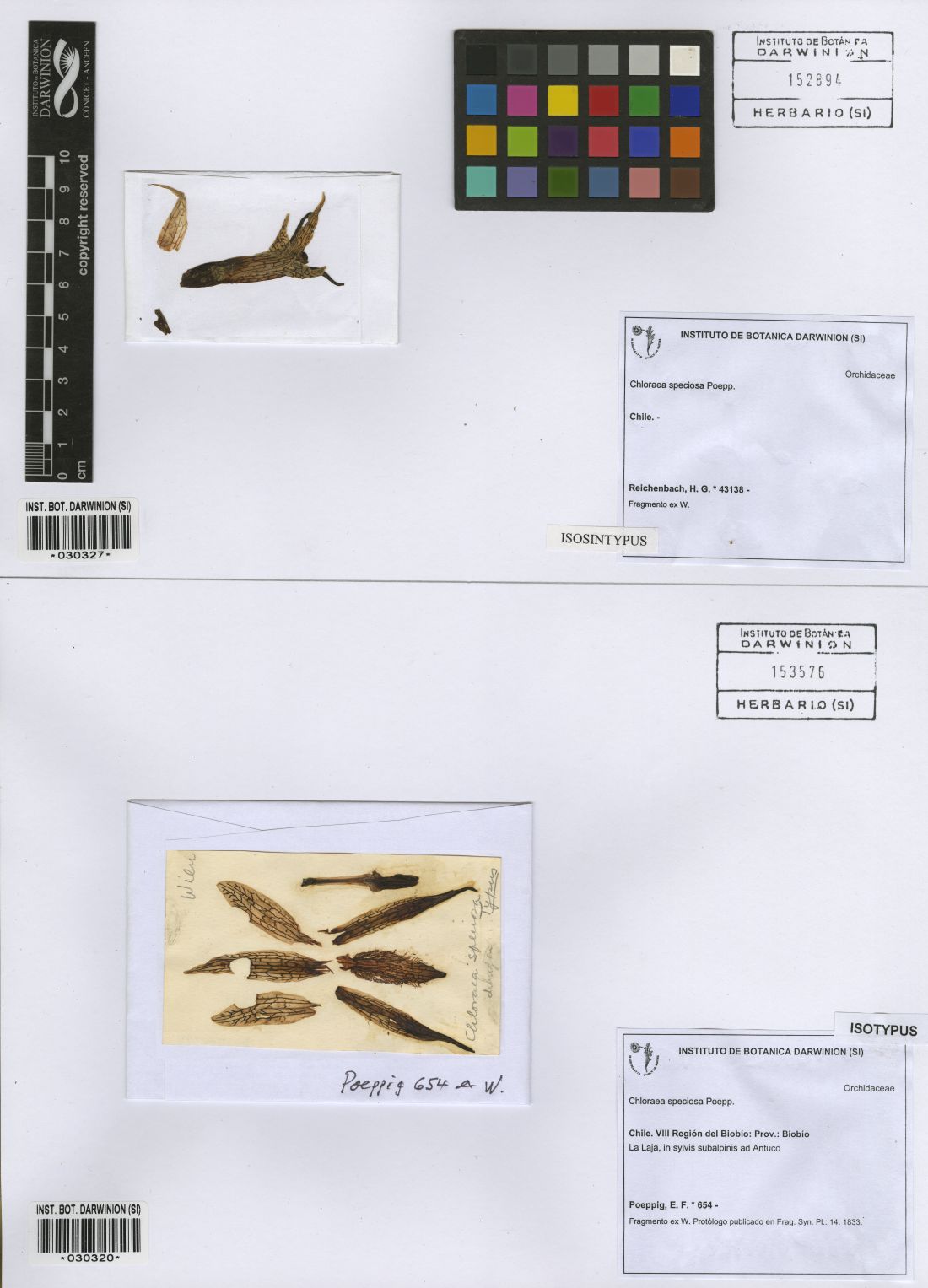 Planta de 40-60 cm de altura, robusta, erguida. Hojas de 10-16 cm, oval-lanceoladas, agudas. Bráctea ovada, aguda, finamente reticulada, envolvente, diáfana, sobrepasando el tamaño de la flor. Inflorescencia en espiga laxa con 5-7 flores grandes, erguidas, vistosas y perfumadas, de color blanco con ápice de los sépalos verde oscuro y nervadura reticulada, ancha, intensamente coloreada de castaño formando un notable contraste con la lámina. Sépalo dorsal de 37-38 X 9-10 mm, 5-7 nervado, oblongo, lanceolado, agudo, ligeramente cóncavo en la mitad inferior y de ápice reflejo; sépalos laterales de 35-50 X 6-8 mm, oblongos, lanceolados, arqueados, con ápice agudo, engrosado y reflejo. Pétalos de 28-37 X 10-12 mm, oblongos, ligeramente oblicuos con 5 nervios longitudinales, ápice subobtuso. Labelo de 29-35 X 10-12 mm, ovado, brevemente unguiculado con 7 nervios longitudinales, recorridos en la mitad basal por laminillas enteras, membranáceas, de borde carnoso que en la mitad apical se transforman en laminillas interrumpidas, entrechas, derechas, algo falcadas de borde carnoso; ápice del labelo engrosado y revoluto; borde laciniado. Columna esbelta de 25-27 mm, con ala angosta (hasta 1 mm), recta; estigma triangular.