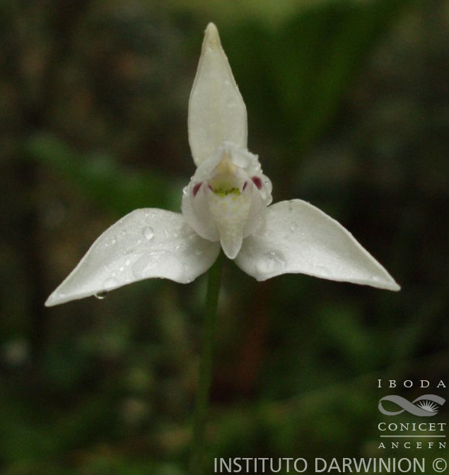 Hierba grácil de 30-50 cm de altura. Raíces delgadas con tubérculos esféricos. Escapo liso, verdoso con 1-2 catáfilas cerca de la base. Hojas de 20-50 X 15-35 mm, ovadas, agudas, dispuestas en un verticilo de 2-4 a un tercio de la altura del escapo. Flor blanca, solitaria, en la axila de una pequeña bráctea que apenas cubre el ovario. Sépalos lanceolados, el dorsal de 18-22 X 6-8 mm, los laterales de 19-23 X 8-10 mm. Pétalos de 15-17 X 8-11 mm, ovados. Labelo de 18 X 10-12 mm, largamente unguiculado, trilobado, lóbulo central cubierto de apéndices capitados, ápice linguiforme, desnudo. Columna de ± 13 mm, arqueada, con ala estrecha, recta. Estigma de 7-8 mm, alargado; róstelo ancho, truncado.