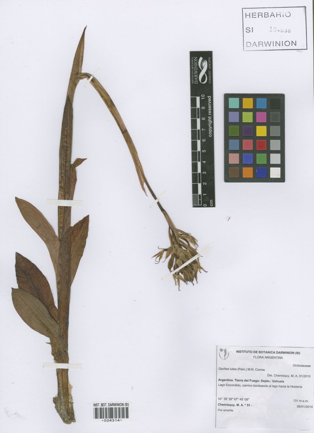 Herbácea, de 30-60 cm de altura. Hojas de 6-15 cm, oval-lanceoladas, dispuestas en roseta basal. Inflorescencia de 2-15 cm de largo, densa, más o menos cilíndrica o piramidal de flores amarillo intenso con caudículas y verrugas verdes; brácteas lanceoladas, agudas, que en la base de la inflorescencia sobrepasan la estatura de la flor. Sépalo dorsal de 14-15 X 3-3,5 mm, lanceolado, agudo, ligeramente cóncavo; sépalos laterales de 15-16 X 3-3,5 mm, lanceolados, con caudículas carnosas de 4-5 mm. Pétalos de 11-12 X 2,5-3 mm, ovalados, obtusiúsculos. Labelo de 4-5 X 3-3,5 mm, trilobado; lóbulos laterales estrechos con nervios oblicuos; lóbulo central alargado con 5 nervios longitudinales sobre los cuales se insertan apéndices capitados; borde del labelo laciniado. Columna de 3,5 mm, recta. Ovario cilíndrico, recto.