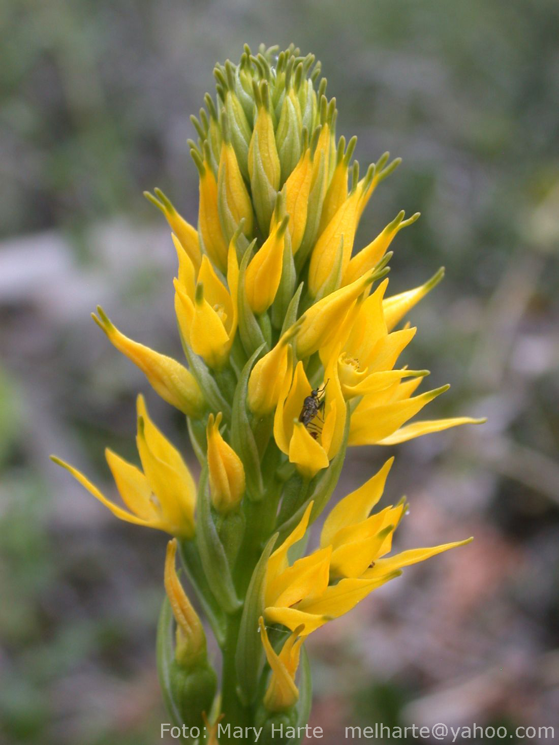Herbácea, de 30-60 cm de altura. Hojas de 6-15 cm, oval-lanceoladas, dispuestas en roseta basal. Inflorescencia de 2-15 cm de largo, densa, más o menos cilíndrica o piramidal de flores amarillo intenso con caudículas y verrugas verdes; brácteas lanceoladas, agudas, que en la base de la inflorescencia sobrepasan la estatura de la flor. Sépalo dorsal de 14-15 X 3-3,5 mm, lanceolado, agudo, ligeramente cóncavo; sépalos laterales de 15-16 X 3-3,5 mm, lanceolados, con caudículas carnosas de 4-5 mm. Pétalos de 11-12 X 2,5-3 mm, ovalados, obtusiúsculos. Labelo de 4-5 X 3-3,5 mm, trilobado; lóbulos laterales estrechos con nervios oblicuos; lóbulo central alargado con 5 nervios longitudinales sobre los cuales se insertan apéndices capitados; borde del labelo laciniado. Columna de 3,5 mm, recta. Ovario cilíndrico, recto.