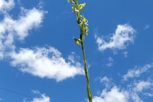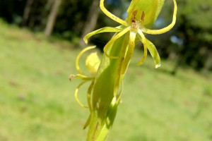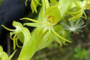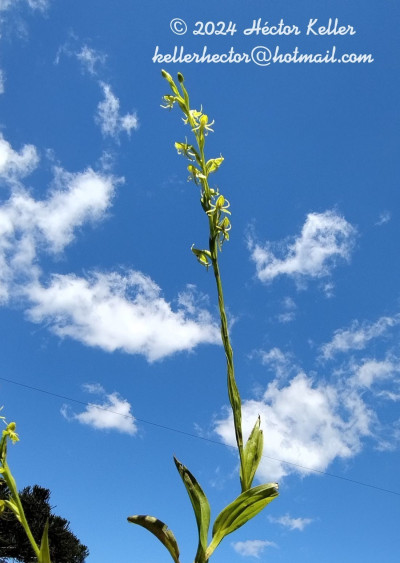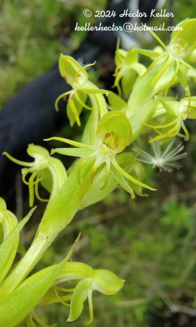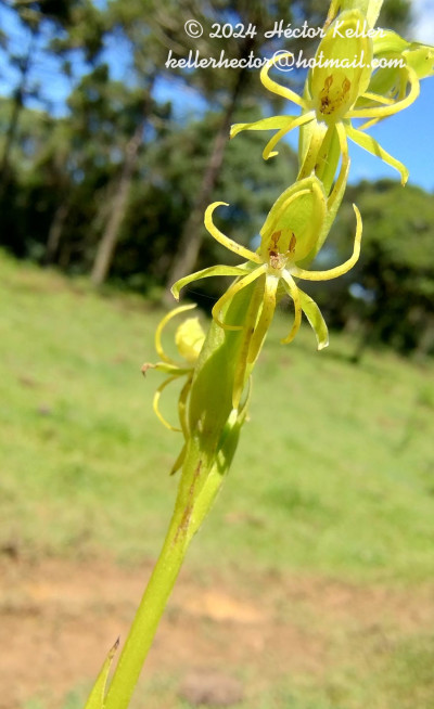 Herbácea, grácil, 30-40 cm de altura, estolonífera. Raíces largas, delgadas, y con frecuencia con largos estolones. Hojas 6-9 × 2,5 cm, elípticas, membranáceas, esparcidas a lo largo del tallo, laxas, semi-amplexicaules en la base. Inflorescencia 12-20 cm de largo, densa, de flores erguidas, verde-amarillentas, sésiles o subsésiles. Brácteas 20 × 8 mm, triangulares, agudas, mucronadas, 3-5-nervias, cubriendo apenas el ovario en la base de la inflorescencia. Sépalos membranáceos, mucronados, el dorsal 5-6,5 × 4-4,5 mm, anchamente ovado, 3-5-nervados, de borde entero a menudamente denticulado; sépalos laterales 7-7,5 ×3-3,5 mm, angostamente ovados, oblicuos, 3-5-nervados, cóncavos en la base, extendidos. Pétalos con segmento posterior de 5,5 × ca. 2 mm, triangular, oblicuo, 2-nervio, segmento anterior filiforme igual o más largo que el posterior. Labelo tripartido, parte entera 2,5 mm de largo, segmento central 5-6 × 1,5 mm, más corto que los laterales, carnoso, cilíndrico, 3-nervio, obtuso, algo geniculado en la base, los laterales ca. 8 × 0,4 mm, filiformes, agudos, uninervados, péndulos a divergentes; espolón ca. 11 × 1 mm, cilíndrico, agudo, péndulo, más corto que el ovario. Columna 2,5 mm de largo, canales de la antera ascendentes, cortos y procesos estigmáticos 1,5 mm de largo, rotundos. Ovario cilíndrico, algo arqueado en el ápice.