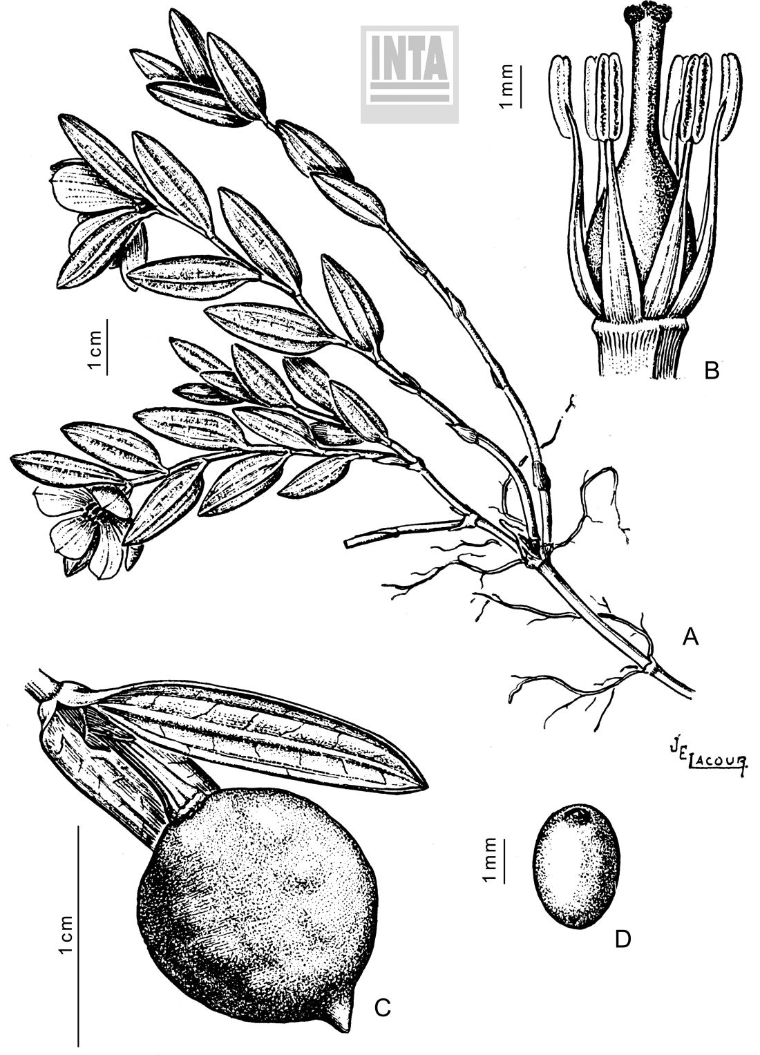 Arbustos rastreros o levemente erguidos de hasta 25 cm de alt. Lámina de 6-22 x 2-7 mm, glaucas en el envés. Pedicelos de 0,5 cm. Flores blancas; tépalos de 10-16 x 5-9 mm. Bayas de 7-10 mm de diám. Semillas 2-3 por lóculo.