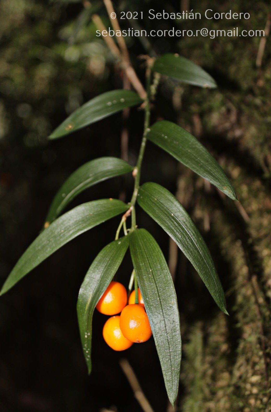 Sufrútice erguido o algo rastrero. Rizoma (sin sustancia de reserva) y tallos rastreros, duros, bracteados, aprox. de 2-2,2 mm de ancho, con catáfilos y raíces adventicias. Brácteas membranáceo-papiráceas de bordes soldados, tubulares, ocreiformes, de 5-7 mm. Ramas foliadas ascendentes, con frecuencia con algunas brácteas cerca de la base, de 20-25 cm. Hojas semiresupinadas oblongo-lanceoladas, con frecuencia algo arqueadas, todas situadas en un plano, retinervadas; pecíolo aprox. de 1 mm; lámina de 18-40 x 4-13 mm. Flores blancas salpicadas de rojo en racimos 2-4-floros, bracteados, pedicelados, ± caliciformes; pedicelos de 18-29 mm, articulados en su parte media. Tépalos exteriores lanceolados, aprox. de 10 x 3,5 mm, los interiores oblanceolados de 10,4 x 5,9 mm. Estambres casi iguales en longitud; filamentos aprox. de 1,7 mm; anteras casi linguiformes, aprox. de 4,4 mm. Ovario sésil, elipsoidal, aprox. de 3,5 x 1,8 mm; estilo de 6-6,5 mm; estigma capitado levemente 3-lobado. Bayas ovoides u oblongo ovoides, aprox. de 9 mm de ancho; semillas de 3,3-3,8 mm de ancho, casi elipsoidales, angulosas.
