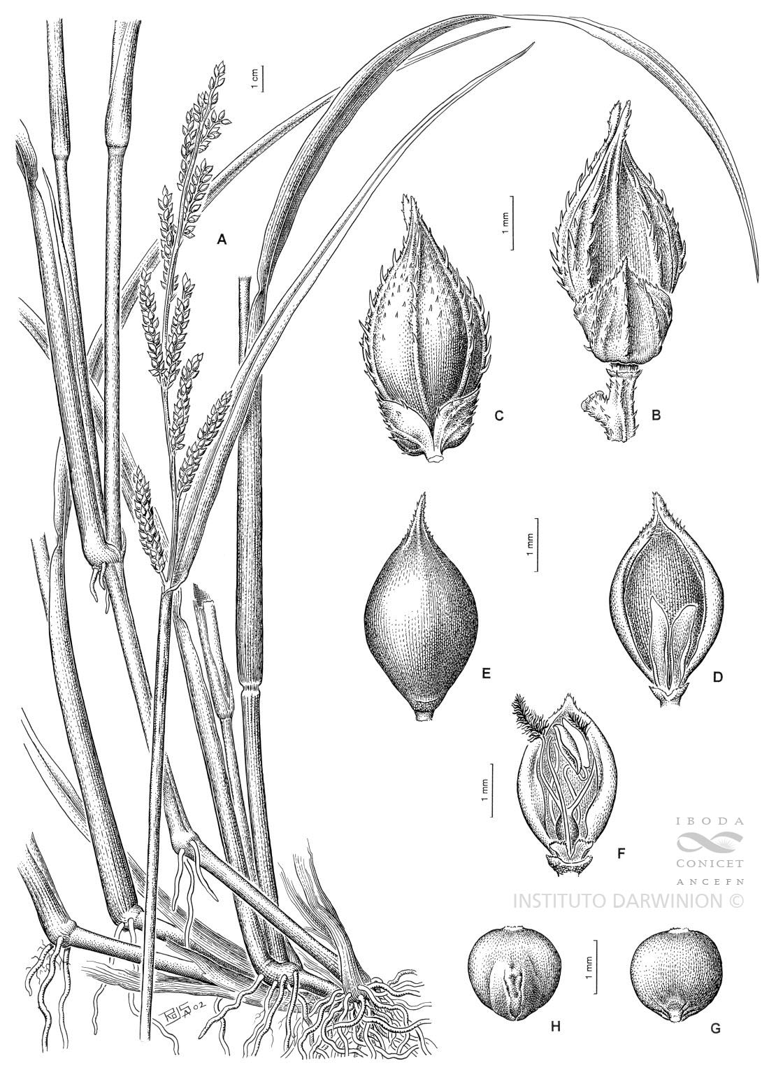 A.Planta. B.Espiguilla con pedicelo. C.Espiguilla. D y E.Antecio con pálea esteril. F.Pálea con lodículas, estambre y ovario. G y H.Cariopsis.