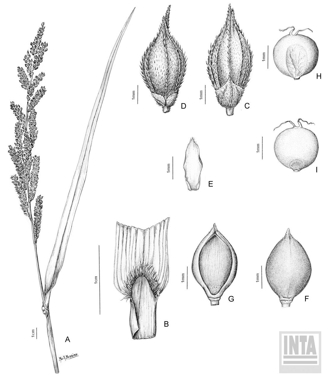 A.Porción de caña florífera. B.Lígula. C,D.Espiguilla. E.Pálea inferior. F,G.Antecio superior. H,I.Cariopse.