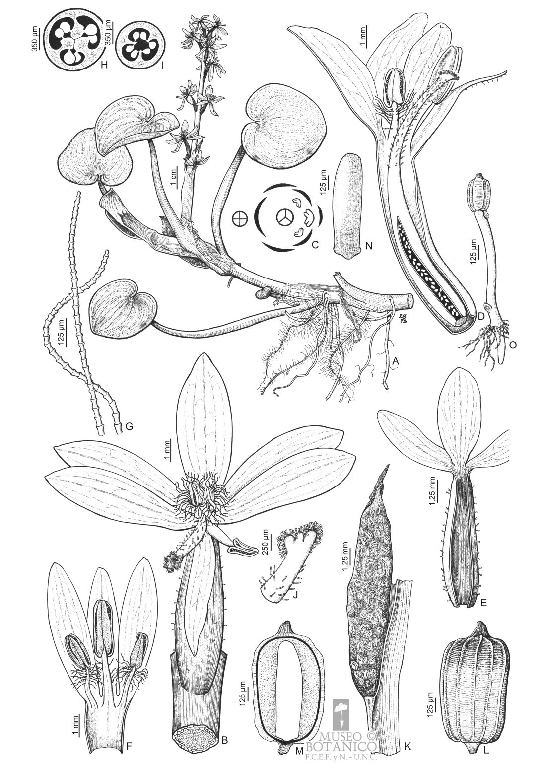 A. Rama florífera. B. Flor. C. Diagrama floral. D. Corte longitudinal por flor. E. Sector de perianto desplegado. F. Sector de perianto desplegado. G. Tricomas moniliformes de los filamentos de los 2 estambres menores. H-I. Transcorte de ovario, ápice y zona media respect. J. Estigma. K. Fruto. L-M. Semilla, vista lateral y corte longitudinal, respect. N. Embrión (fruto y semilla de A. T. Hunziker 11969, CORD; rama de A. T. Hunziker 18685, CORD).