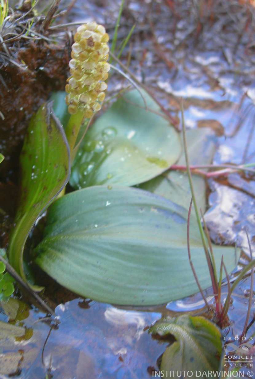 Hierbas parcialmente sumergidas. Tallo simple o algo ramificado, hasta 50 cm de largo X 3-5 mm de diámetro. Hojas dimorfas, las sumergidas lanceoladas o linear-lanceoladas de 4-7 X 0,5-1,5 cm, sésiles o con breves seudopecíolos; las flotantes de 3-8 X 1,5-5 cm, elípticas hasta ovales, coriáceas, plurinervadas longitudinalmente, con pecíolos de 4-20 cm, estípulas libres de 4-6 X 0,5-1 cm, lanceoladas, amplexicaules en la base. Inflorescencias con pedúnculos de 5-15 cm de largo X 1-3 mm de diámetro, en las axilas de las hojas flotantes; espigas cilíndricas densas, de 2-6 cm. Apéndices tepaloides unguiculados, uña de ± 1 mm y lámina flabelada de 1-2 X 1,5-2,5 mm. Anteras de 1,5-2 mm, ligeramente espiraladas. Ovarios subclaviformes de ± 2 mm; estigmas sésiles en forma de silla de montar. Aquenios sub-ovoides de 3-5 mm, comprimidos y con la superficie irregularmente rugosa.