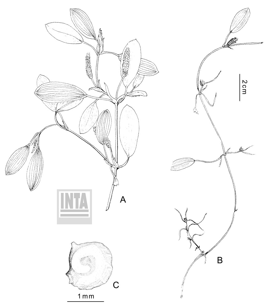 Plantas mayores de 50 cm de largo. Tallos filiformes. Hojas dimorfas: las flotantes de 1-3 × 0,5-1,2 cm, pecioladas, angostamente ovales, coriáceas, (5)-7-11-nervadas, estípulas libres, hasta de 1 cm de largo; hojas sumergidas 14-40 × 0,2-0,4 mm, lineares, membranáceas, translúcidas, 1(-3)-nervadas; estípulas ca. 10 mm de largo, adnatas 1-3 mm a la base de la hoja. Pedúnculos de 1-1,2 cm de largo. Espigas compactas, de 0,1-2 cm de largo, con (1)-2-4 flores, en nudos de hojas sumergidas y 4-multifloras, en nudos de hojas flotantes. Fructificación abundante. Frutos de 1,2-1,5 × 1-1,5 mm, redondeados, cocleados, con rostro apenas visible, drupéolas de lados planos con las marcas del embrión, carena dorsal muy marcada y las laterales conspicuas. Embrión curvado.