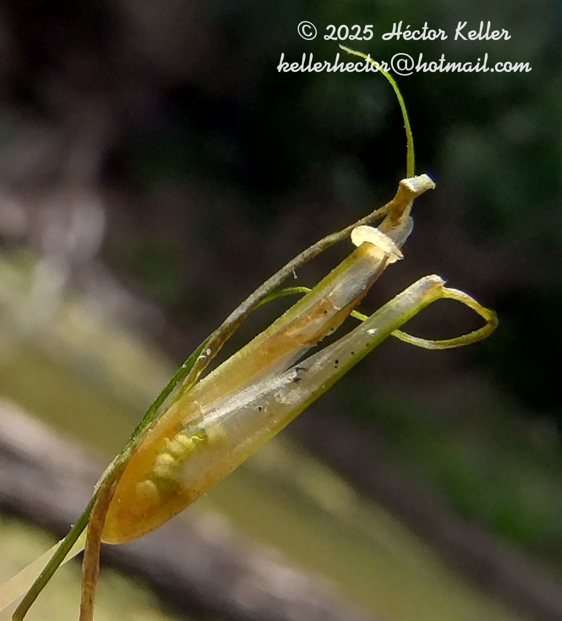Rizomas largos, cilíndricos, de 0,6- 0,7 mm lat., entrenudos de 3-5 cm y tallos delgados, ramificados, de 0,25- 0,5 mm lat. Hojas de 5-15 cm × 0,2-0,7 mm. Vainas de hojas alternas de (5) 7-16 (20) × (0,4) 0,6-1 (1,5) mm; las de hojas subopuestas (floríferas) de (5) 7-14 (19) × 0,7-1,6 mm. Pedúnculos rectos a curvos no espiralizados o con 1 espiral en la base, de 3-16 cm. Inflorescencias de 1,5-4 (5) mm. Flores con (3) 4 carpelos y anteras esfero-elipsoidales a reniformes de 0,4-1,4 mm. Polen curvado de 70-90 × 25-30 µm. Podoginos de 5-25 × 0,2-0,5 mm. Drupéolas piriformes ± simétricas o asimétricas, levemente comprimidas de 1,3-2,2 × 1,3-1,6 mm con rostro ligeramente curvado de 0,5-1 mm. Endocarpo con rostro de ± 1 mm y opérculo de 1-1,2 × 0,3-0,7 mm. La variedad tipo se diferencia por sus pedúnculos rectos a curvos de 0,5- 3 cm. Inflorescencias de 1,5-3,2 mm; anteras esfero-elipsoidales de 0,4-0,7 mm cubriendo sólo parcialmente al raquis en vista lateral.