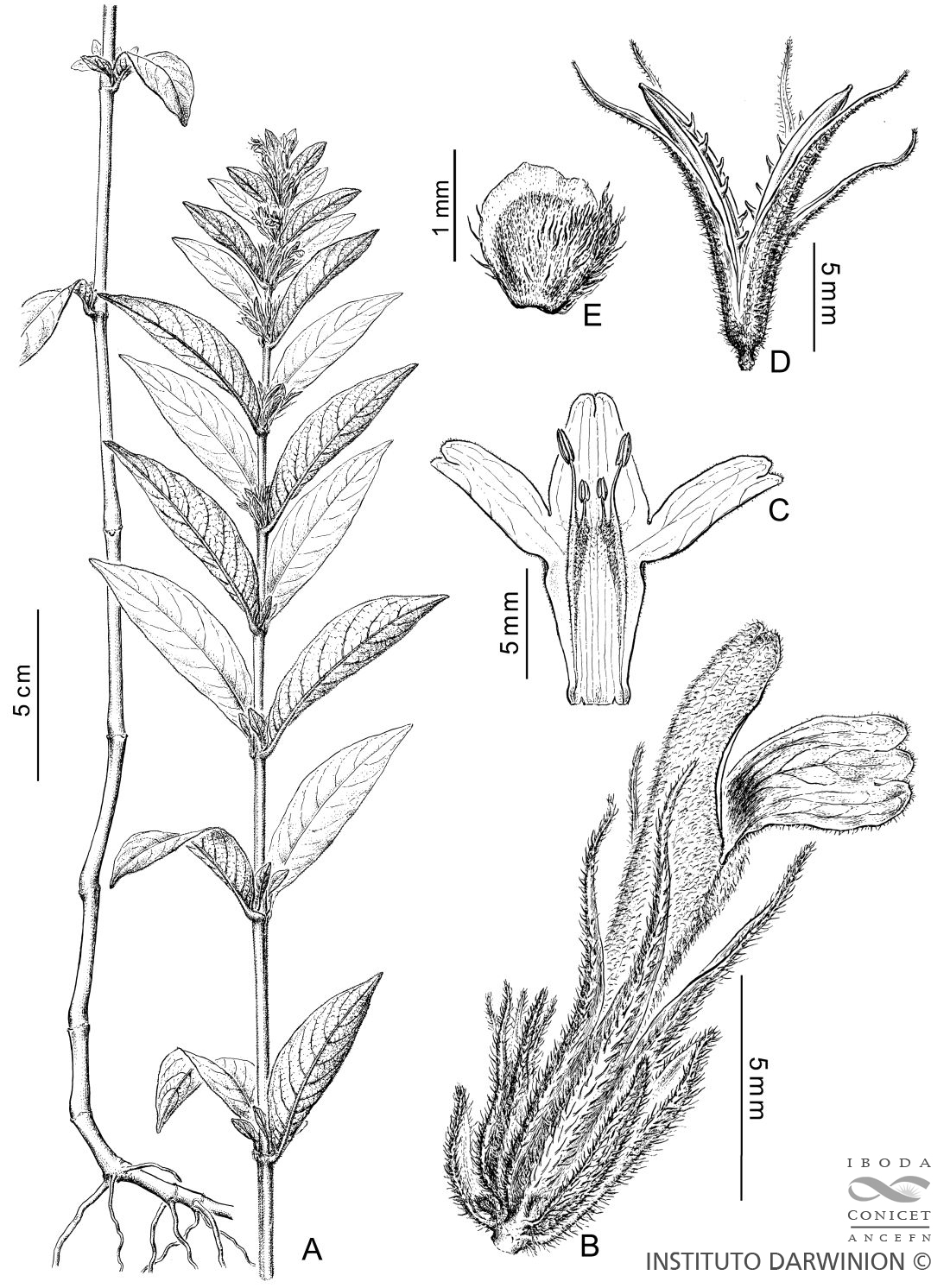Hierbas palustres o acuáticas con rizoma horizontal y tallos aéreos erectos, hasta de 1 m de alto, obtusamente tetrágonos, simples o ramificados, glabros o pubérulos. Hojas subsésiles a cortamente pecioladas, angostamente elípticas a oblongolanceoladas, de 3-20 × 0,5-4 cm, agudas o levemente acuminadas en el ápice, atenuadas en la base, glabras o pubérulas a densamente pubescentes. Flores subsésiles dispuestas en cimas axilares sésiles y condensadas, formando seudoverticilos densos en los nudos superiores de los tallos; brácteas axilantes de las cimas no diferenciadas de las hojas normales; bractéolas angostamente elípticas a lanceoladas, más cortas que el cáliz, glabras o pubérulas; cáliz de 0,6-1,2 cm de largo, poco acrescente después de la antesis, con los segmentos angostamente lanceolados, ciliados, más cortos o de la misma longitud que la cápsula; corola blanquecina de 6-13 mm de largo, con tubo de 4-7 mm de largo, garganta poco dilatada y labios de 2-4,5 × 1-3 mm, el posterior levemente 2-lobado, el anterior profundamente 3-lobado, con los lóbulos ca. 2-3 × 1,2-2 mm; anteras ca. 1 mm de largo, las posteriores algo reducidas, todas inclusas bajo el labio posterior. Fruto una cápsula angostamente oblonga, de 6-14 mm de largo y 2 mm de diámetro, lustrosa. Semillas 16-20, orbiculares, de 1-1,4 mm de diámetro, pubescentes