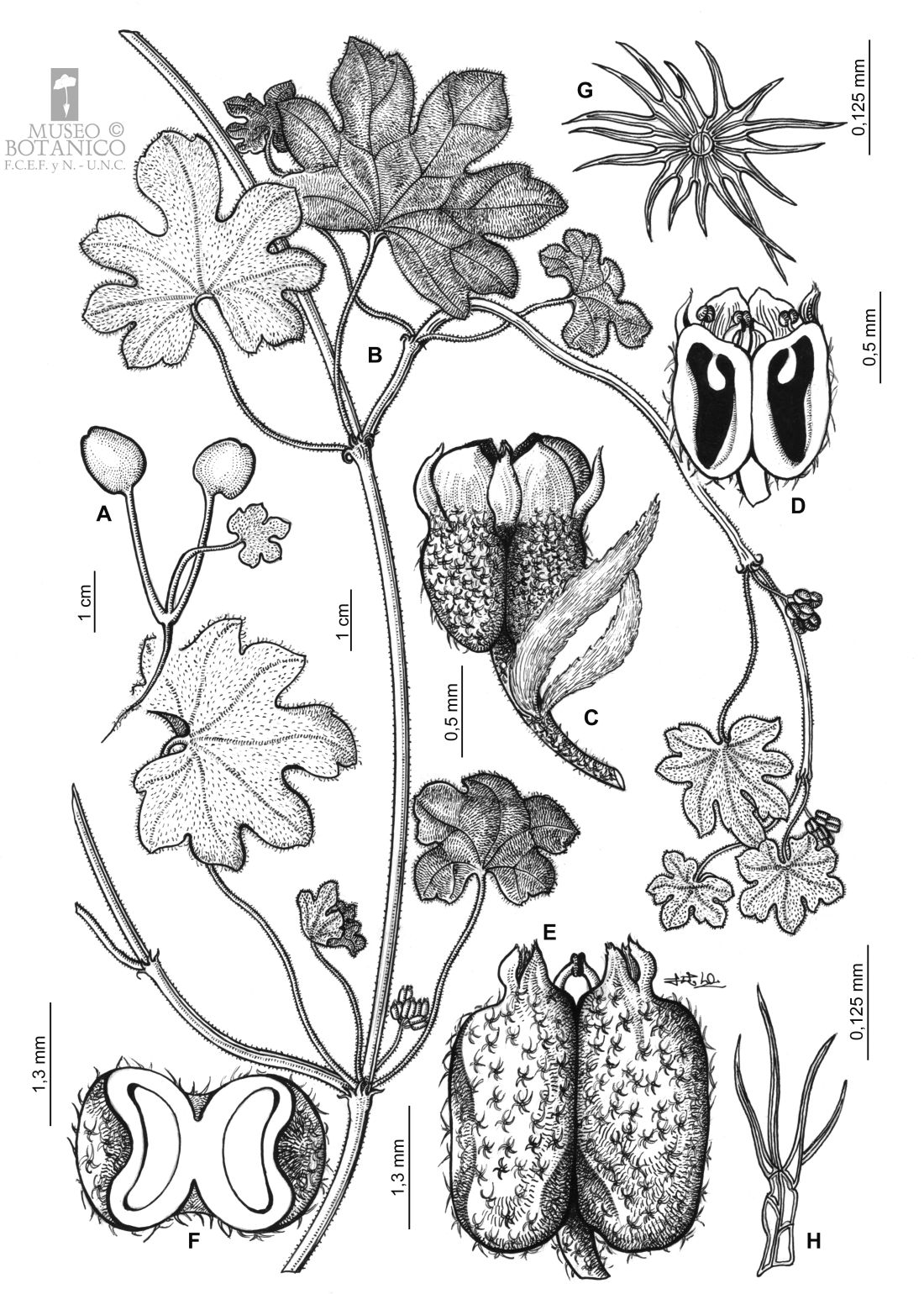 A. Plántula. B. Rama. C. Flor, vista lateral. D. Corte longitudinal por flor. E. Fruto, vista lateral. F. Corte transversal por fruto. G-H. Tricomas del fruto en vista superior y lateral respect.