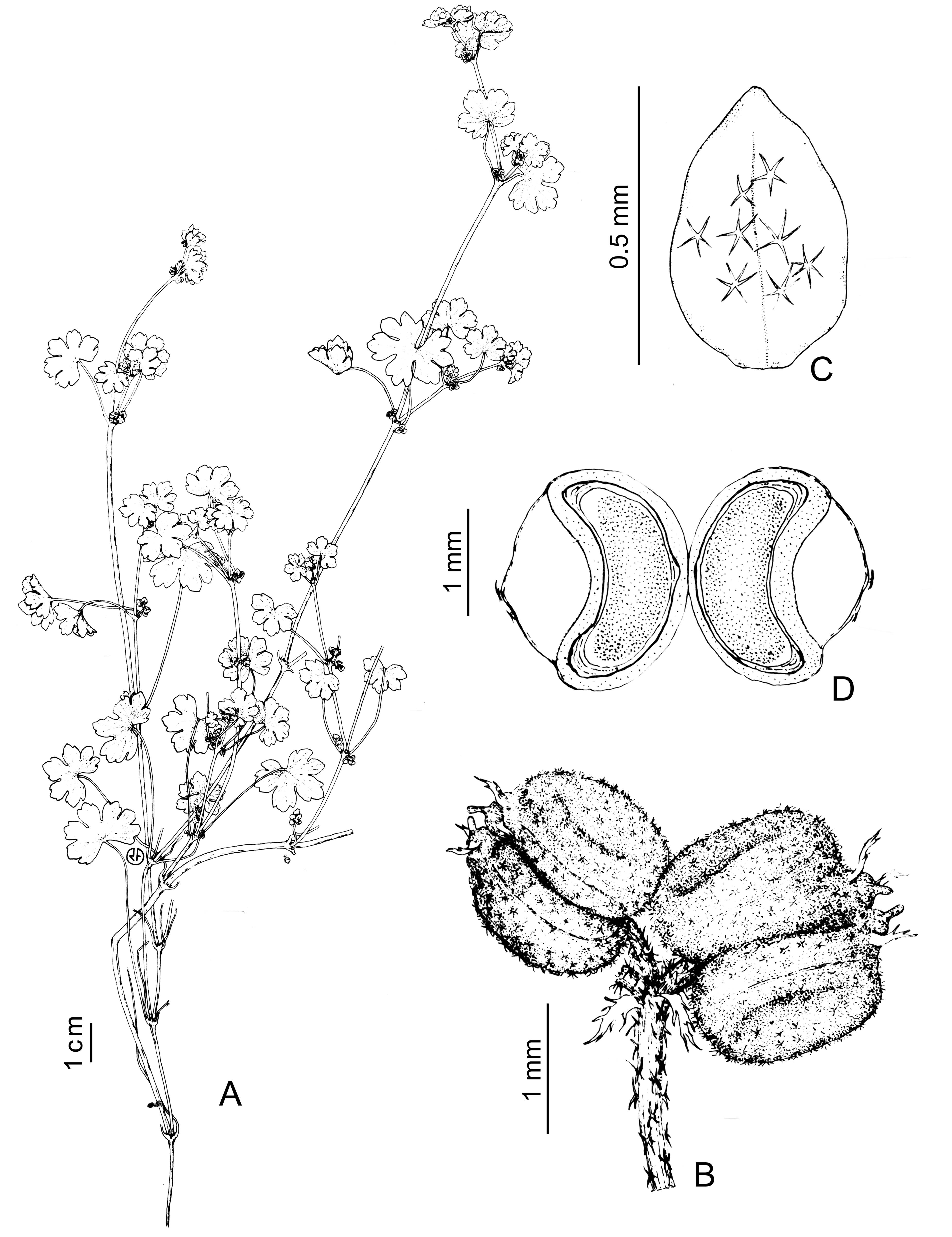 Hierbas anuales, decumbentes, de 5-60 cm de alto; tallos a veces un poco inflados. Hojas opuestas, salvo las primeras, membranáceas o algo carnosas, pecíolos de 1,5-12 cm de largo; láminas de las hojas basales de 0,5-3 × 0,5-4,5 cm, orbicular reniformes, cordadas en la base, 5-9 palmatilobadas con senos estrechos, los lóbulos subiguales, anchamente elípticos u obovados, obtusos o redondeados, o los más estrechos agudos, mucronulados o ciliados en el ápice, enteros a 3-lobulados, en la cara adaxial con pelos 2-4 ramificados, la cara abaxial muchas veces tomentosa, con pelos estrellados de 6-8 rayos; hojas caulinares superiores algo menores, más cortamente pecioladas, por lo general 5-lobuladas con lóbulos enteros. Umbelas 1-5 floras, todas o las distales subsésiles, pedúnculos hasta de 1 cm de largo; involucro de varias brácteas lanceoladas. Flores amarillo-verdosas o púrpuras; pétalos estrellado-pubescentes en el dorso. Fruto ovoide a globoso, de 1,5-2 × 1,5-2,5 mm, estrellado-pubescente, con una cámara de aire entre el endocarpio y exocarpio que colapsa al secarse el fruto resultando en un dorso deprimido.