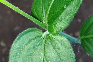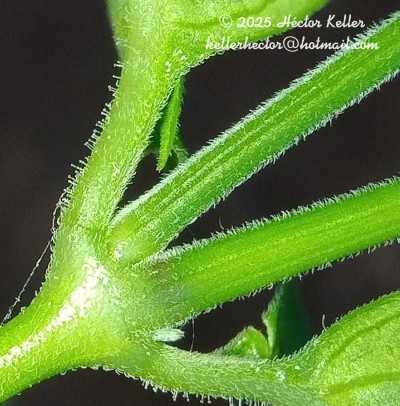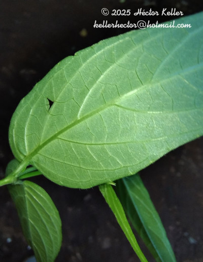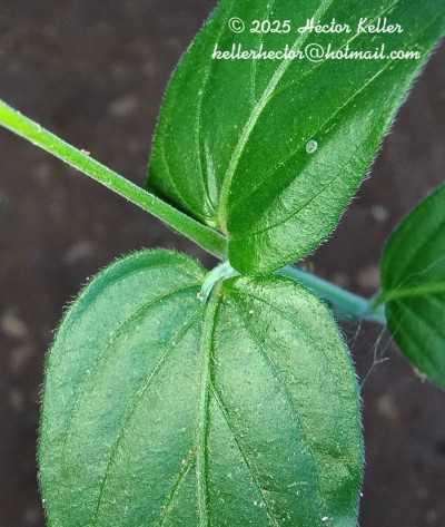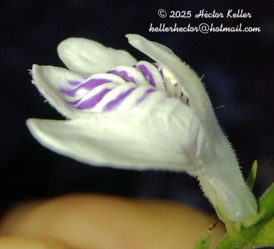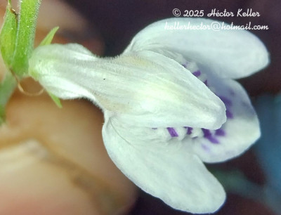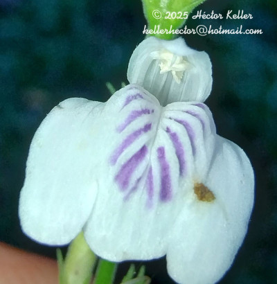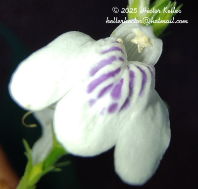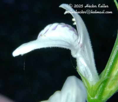 Hierbas débiles, enraizadoras en la base, hasta de 60 cm de alto, con tallos erectos, subtetrágonos, ramificados, longitudinalmente surcados, pubérulos a glabros. Hojas cortamente pecioladas o subsésiles, con la lámina angostamente ovada, de 4-7 × 1,2-2,5 cm, largamente aguda en el ápice, redondeada a levemente cordada en la base, algo discolora, glabra o muy laxamente pilosa. Inflorescencias en espigas terminales y laterales de 10-14 cm de largo (algunas menores), laxas, delicadas, con pedúnculos ca. 2 cm de largo; brácteas angostamente triangulares, de 2-3 × 0,5 mm, agudas, aquilladas, glabras o pubérulas; bractéolas del mismo largo; cáliz profundamente 4-partido, con los segmentos lanceolados, ca. 3 × 0,5 mm, agudos, glabros; corola blanca ca. 9 mm de largo con tubo obcónico de 3-4 mm de largo y labios de 4-5 mm de largo, el posterior triangular, ca. 2 mm de ancho en la base, obtuso; el anterior 3-lobado, con los lóbulos de 1,5-2 × 2,5 mm (los laterales algo menores), redondeados; estambres exertos hasta la mitad del labio posterior, con las tecas superpuestas, ca. 1 mm de largo, separadas por un conectivo ancho, la superior mayor y oblicua, ambas agudas en la base. Fruto una cápsula delicada, angostamente claviforme, de 7-8 mm de largo × 2 mm de diámetro, sólida y lateralmente estrechada en el tercio inferior, glabra. Semillas aplanadas, ca. 1 mm de diámetro, con papilas cortas; retináculos de menos de 1 mm de largo.