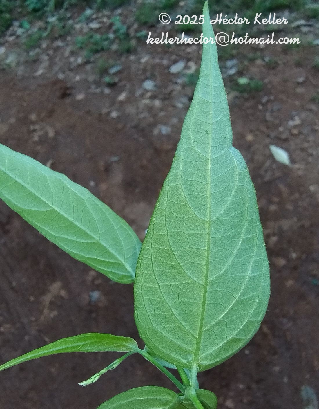 Hierbas débiles, enraizadoras en la base, hasta de 60 cm de alto, con tallos erectos, subtetrágonos, ramificados, longitudinalmente surcados, pubérulos a glabros. Hojas cortamente pecioladas o subsésiles, con la lámina angostamente ovada, de 4-7 × 1,2-2,5 cm, largamente aguda en el ápice, redondeada a levemente cordada en la base, algo discolora, glabra o muy laxamente pilosa. Inflorescencias en espigas terminales y laterales de 10-14 cm de largo (algunas menores), laxas, delicadas, con pedúnculos ca. 2 cm de largo; brácteas angostamente triangulares, de 2-3 × 0,5 mm, agudas, aquilladas, glabras o pubérulas; bractéolas del mismo largo; cáliz profundamente 4-partido, con los segmentos lanceolados, ca. 3 × 0,5 mm, agudos, glabros; corola blanca ca. 9 mm de largo con tubo obcónico de 3-4 mm de largo y labios de 4-5 mm de largo, el posterior triangular, ca. 2 mm de ancho en la base, obtuso; el anterior 3-lobado, con los lóbulos de 1,5-2 × 2,5 mm (los laterales algo menores), redondeados; estambres exertos hasta la mitad del labio posterior, con las tecas superpuestas, ca. 1 mm de largo, separadas por un conectivo ancho, la superior mayor y oblicua, ambas agudas en la base. Fruto una cápsula delicada, angostamente claviforme, de 7-8 mm de largo × 2 mm de diámetro, sólida y lateralmente estrechada en el tercio inferior, glabra. Semillas aplanadas, ca. 1 mm de diámetro, con papilas cortas; retináculos de menos de 1 mm de largo.
