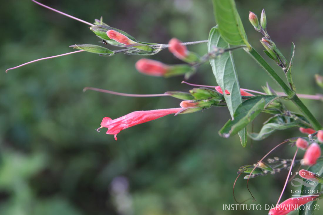Arbusto hasta de 2 m de alto, con tallos erectos o apoyantes, marcadamente tetrágonos en su juventud, generalmente glabros, cilíndricos y engrosados por encima de los nudos a la madurez. Hojas con pecíolo de 0,3-1,5(4) cm de largo; láminas ovadas o elípticas, de 3-10(-15) × 1,5-4(-6) cm, acuminadas en el ápice, redondeadas y algo decurrentes en la base, onduladas a irregularmente dentadas en el margen, totalmente glabras a velutino-pubérulas en el envés. Flores dispuestas en cimas pedunculadas, las que generalmente surgen alternadamente en una u otra de las axilas de los pares de hojas superiores; cimas multifloras, iguales o más largas que las hojas, con pedúnculo de 3-7 cm de largo; yemas supernumerarias frecuentes en las ramificaciones; bractéolas angostamente obovadas a oblanceoladas, pequeñas, las inferiores generalmente foliáceas y más grandes que el cáliz; cáliz de 5-15 mm de largo, con los segmentos lineal-lanceolados, de 4-12 × 1-2 mm, agudos, pubérulos; corola roja, de 3-4(-6) cm de largo, con tubo basal angosto de 1-2 cm de largo, garganta angostamente cilíndrica, algo inflada posteriormente, de 1-2 cm de largo × ca. 8 mm de diámetro; lóbulos orbicular-oblongos, erectos, ca.. 5 mm de largo, emarginados; estambres subexertos con filamentos de 1-1,5 cm de largo, anteras ca. 4 mm de largo, obtusas; ovario glabro; estilo ca. 3 cm de largo, exerto. Cápsulas de contorno claviforme, de 1,5-2 cm de largo × 4 mm de diámetro, sólido estipitadas hasta 3- 5 mm de su altura, glabras. Semillas 8-12, ca. 2 mm de diámetro, con pelos mucilaginosos en el margen al mojarse; retináculos ca. 2 mm de largo, agudos.
