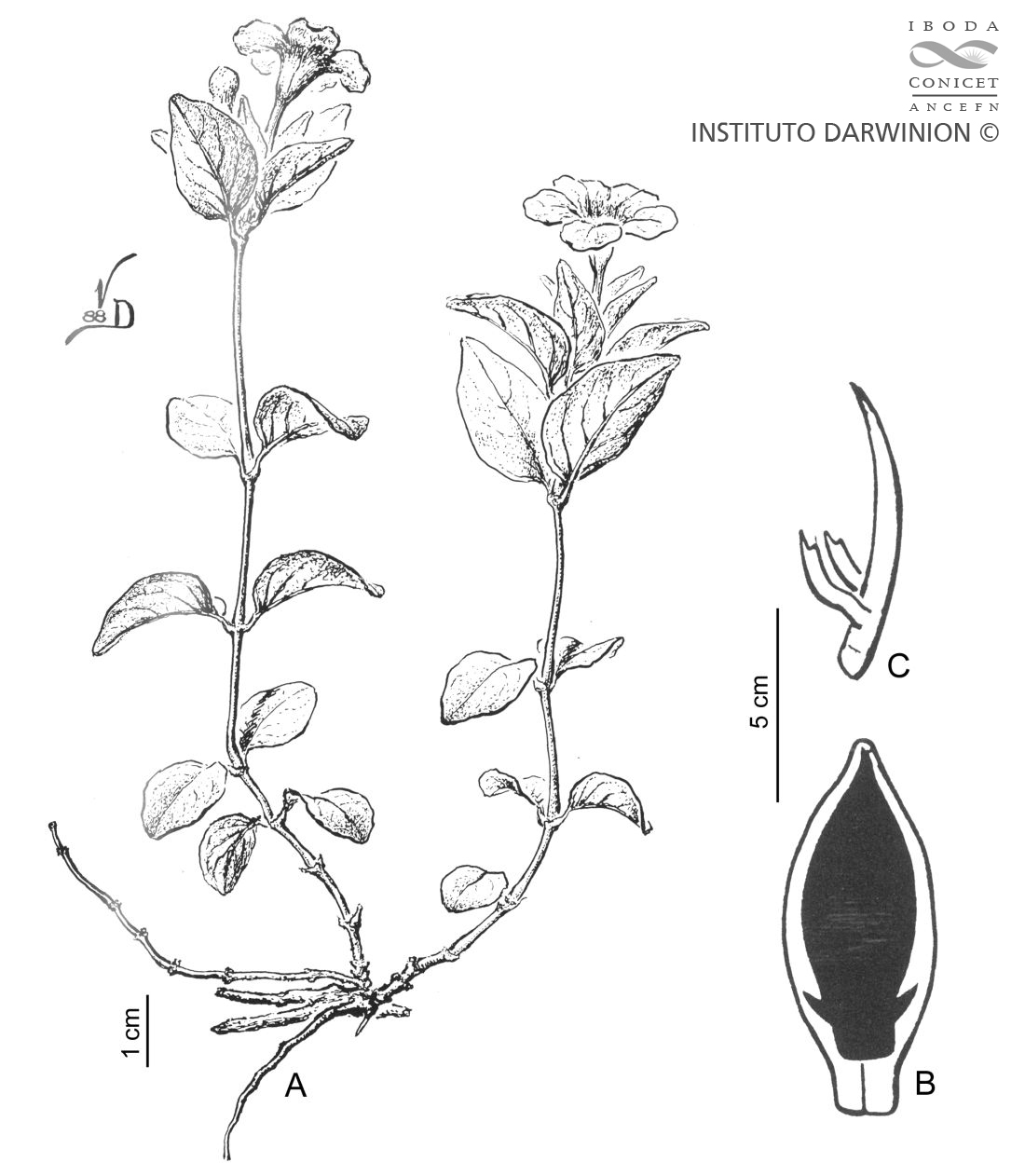 Hierba pequeña de 15-25 cm de alto, naciendo de un rizoma delgado con raíces fibrosas. Tallos débiles, poco ramificados, erectos o decumbentes, cilíndricos, cortamente adpreso- pubescentes, con entrenudos largos. Hojas cortamente pecioladas; láminas ovadas a orbiculares, de 1,5-2 × 0,8-1,3 cm, obtusas o redondeadas en el ápice, truncadas en la base, las inferiores más pequeñas, todas pubérulas en la haz y con pequeñas glándulas punctiformes en el envés. Flores sésiles, solitarias en las axilas de las hojas superiores; bractéolas obsoletas; cáliz de 5 mm de largo, con los segmentos lineal- lanceolados, ca. 4 × 1 mm, agudos, adpreso-pubérulos y ciliados; corola erecta, azul, de 2-3 cm de largo, con el tubo basal angosto, de 1,2-1,5 cm de largo, la garganta obcónico- acampanada, de 5-6 × 4-5 mm; lóbulos patentes, suborbiculares, ca. 8 mm de diámetro, algo emarginados; estambres inclusos, ca. 7 mm de largo, anteras de 2 mm de largo; ovario y estilo pubérulos. Cápsulas ovoides, de 7-9 mm de largo × 4 mm de grosor, pubérulas, huecas casi hasta la base; placentas que se separan con los retináculos y las semillas de las paredes de la cápsula madura. Semillas 4-8, ca. 2 mm de diámetro, con pelos mucilaginosos al mojarse; retináculos ca. 1,5 mm de largo.