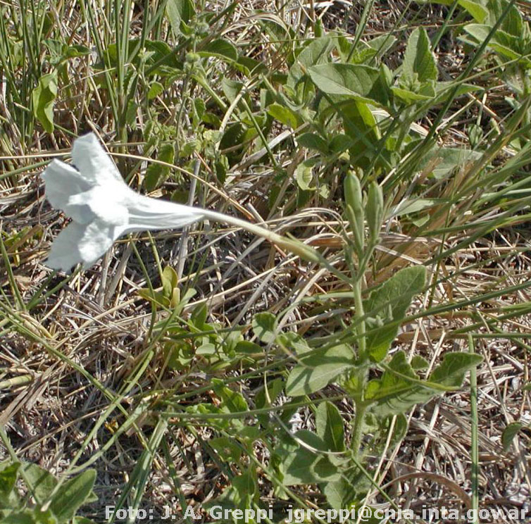 Hierba perenne con rizoma corto provisto de raíces adventicias engrosadas, fusiformes; tallos subtetrágonos, erectos a algo decumbentes, de 20-80(-100) cm de alto, pilosos y glanduloso-pubescentes en su juventud, glabrescentes a la madurez. Hojas opuestas con pecíolo de 0,3-2 cm de largo, largamente piloso; láminas ovadas o elípticas, de 2,5-7 × 1,5-4 cm, obtusas y mucronadas en el ápice, cuneadas en la base, levemente decurrentes sobre el pecíolo, con el margen entero a leve e irregularmente aserrado, ondulado, la superficie pilosa sobre la nervadura. Flores cortamente pediceladas dispuestas en dicasios pedunculados terminales o axilares agrupados en tirsos paucifloros; brácteas y bractéolas lineales, pequeñas, foliáceas; cáliz con los segmentos lineales de 1,5-2 cm de largo, agudos, pilosos y glanduloso-pubescentes; corola blanca de 5- 9 cm de largo, con tubo basal de 2,5-5 cm de largo, garganta de 1,5-3 × ca. 1 cm en su parte más amplia; lóbulos patentes, orbiculares, ca. 1 cm × 1 cm, con el margen ondulado; estambres inclusos, anteras ca. 5 mm de largo, filamentos de 5-8 mm de largo. Cápsulas de contorno oblongo-elíptico de 2,5-3 × 0,5 cm, huecas casi hasta la base. Semillas 20-24, de 3 mm de diámetro, adpreso-pilosas; retináculos de 2,5 mm de largo.