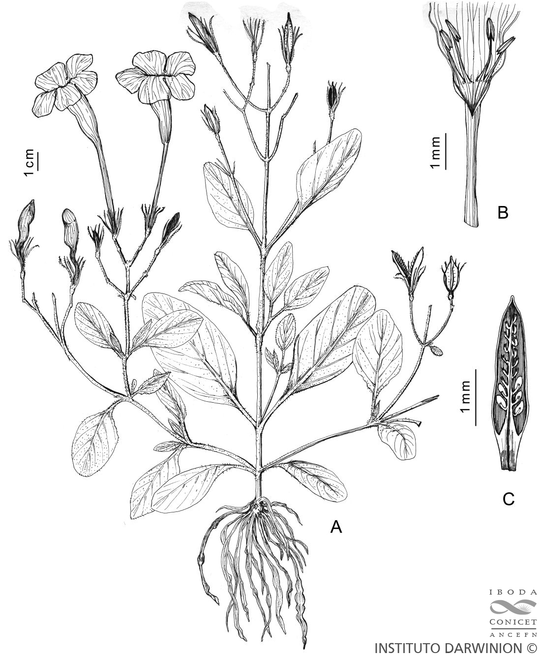 Hierba perenne con rizoma corto provisto de raíces adventicias engrosadas, fusiformes; tallos subtetrágonos, erectos a algo decumbentes, de 20-80(-100) cm de alto, pilosos y glanduloso-pubescentes en su juventud, glabrescentes a la madurez. Hojas opuestas con pecíolo de 0,3-2 cm de largo, largamente piloso; láminas ovadas o elípticas, de 2,5-7 × 1,5-4 cm, obtusas y mucronadas en el ápice, cuneadas en la base, levemente decurrentes sobre el pecíolo, con el margen entero a leve e irregularmente aserrado, ondulado, la superficie pilosa sobre la nervadura. Flores cortamente pediceladas dispuestas en dicasios pedunculados terminales o axilares agrupados en tirsos paucifloros; brácteas y bractéolas lineales, pequeñas, foliáceas; cáliz con los segmentos lineales de 1,5-2 cm de largo, agudos, pilosos y glanduloso-pubescentes; corola blanca de 5- 9 cm de largo, con tubo basal de 2,5-5 cm de largo, garganta de 1,5-3 × ca. 1 cm en su parte más amplia; lóbulos patentes, orbiculares, ca. 1 cm × 1 cm, con el margen ondulado; estambres inclusos, anteras ca. 5 mm de largo, filamentos de 5-8 mm de largo. Cápsulas de contorno oblongo-elíptico de 2,5-3 × 0,5 cm, huecas casi hasta la base. Semillas 20-24, de 3 mm de diámetro, adpreso-pilosas; retináculos de 2,5 mm de largo.