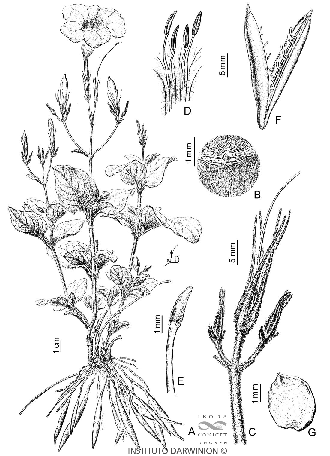 Hierba perenne con rizoma corto provisto de raíces adventicias engrosadas, fusiformes; tallos subtetrágonos, erectos a algo decumbentes, de 20-80(-100) cm de alto, pilosos y glanduloso-pubescentes en su juventud, glabrescentes a la madurez. Hojas opuestas con pecíolo de 0,3-2 cm de largo, largamente piloso; láminas ovadas o elípticas, de 2,5-7 × 1,5-4 cm, obtusas y mucronadas en el ápice, cuneadas en la base, levemente decurrentes sobre el pecíolo, con el margen entero a leve e irregularmente aserrado, ondulado, la superficie pilosa sobre la nervadura. Flores cortamente pediceladas dispuestas en dicasios pedunculados terminales o axilares agrupados en tirsos paucifloros; brácteas y bractéolas lineales, pequeñas, foliáceas; cáliz con los segmentos lineales de 1,5-2 cm de largo, agudos, pilosos y glanduloso-pubescentes; corola blanca de 5- 9 cm de largo, con tubo basal de 2,5-5 cm de largo, garganta de 1,5-3 × ca. 1 cm en su parte más amplia; lóbulos patentes, orbiculares, ca. 1 cm × 1 cm, con el margen ondulado; estambres inclusos, anteras ca. 5 mm de largo, filamentos de 5-8 mm de largo. Cápsulas de contorno oblongo-elíptico de 2,5-3 × 0,5 cm, huecas casi hasta la base. Semillas 20-24, de 3 mm de diámetro, adpreso-pilosas; retináculos de 2,5 mm de largo.